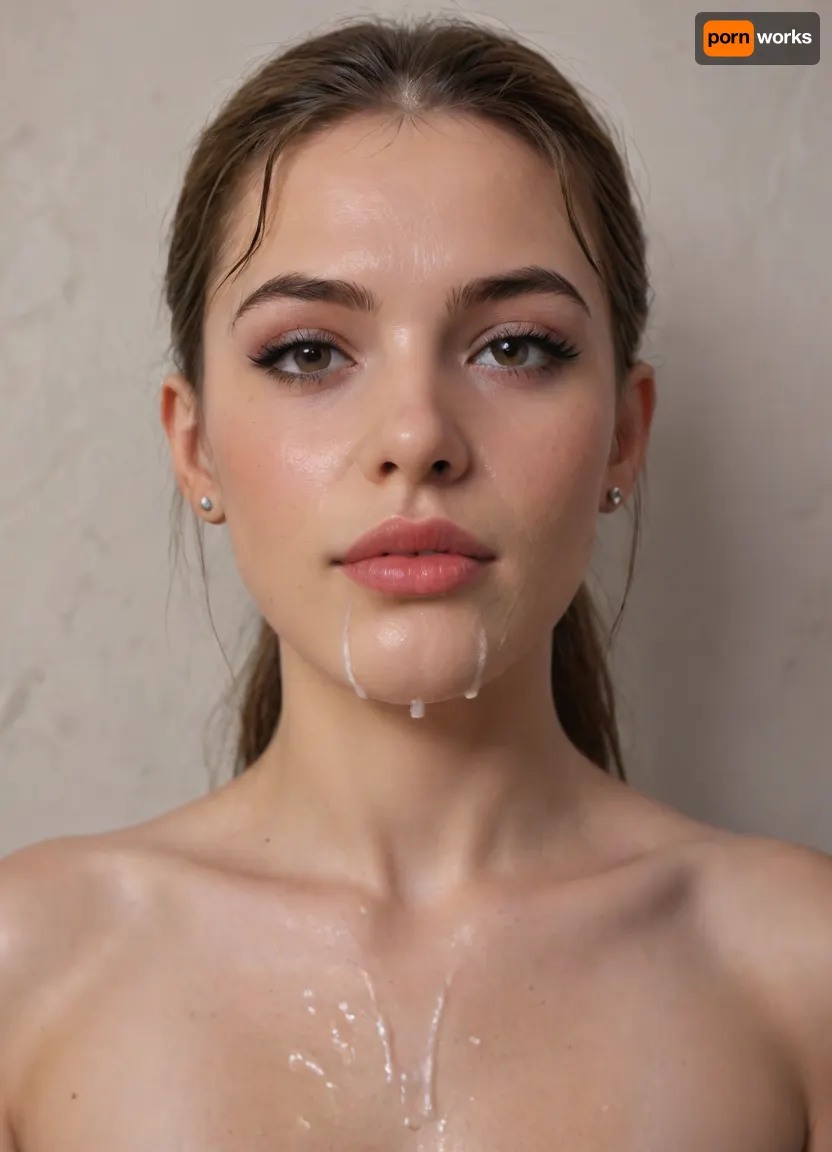 Ultra-realistic portrait, ((macro Closeup bukkake face)), camera very very close to face, of a athletic, slender natural beauty supermodel with pale skin drenched in semen from face to body, long dark brown hair styled in a thick ponytail, black hair tie, brown eyes, and subtle, decent makeup. Her face is softly oval, framed by natural brows and a Apologetic, regretful face expression, thick semen is Apologetic from her lips, she has several shots of Cum semen on her face, The scene is set in a stylish, avant-garde urban workout gym lounge with innovative architecture, 8k., bukkake, artoflips, uoclips, lips, lipstick, art, of, makeup, eyeliner, eyelashes, <lora:puppernova-v1:.7>, <lora:Art_Of_Lips_PONY_XL_By_UOC:1.7>, <lora:Modern_MakeUp_XL_v0_1:1.1>