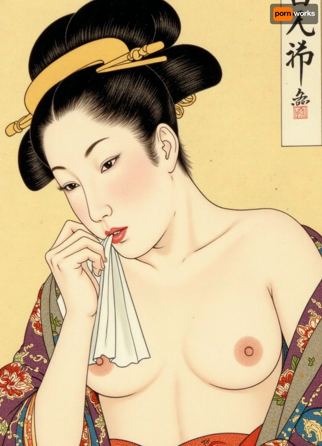 (woodcut woodblock print in the Japanese ukiyo-e style), (on wood panel:1.6), (in the style of Kitagawa Utamaro), depicting, (detailed portrait of a geisha), close-up, Edo period geisha, with black hair gathered in an elaborate hairstyle with a wooden hairpin, (biting down on a white cloth), (red lips), bared breasts, pensive expression, (yellow background), facial features traditional for ukiyo-e style, (high quality), detailed work, (fine lines), traditional Japanese patterns on kimono, (high resolution), graceful composition, (graceful pose), (((ukiyo-e in the style of Kitagawa Utamaro:1.7)))