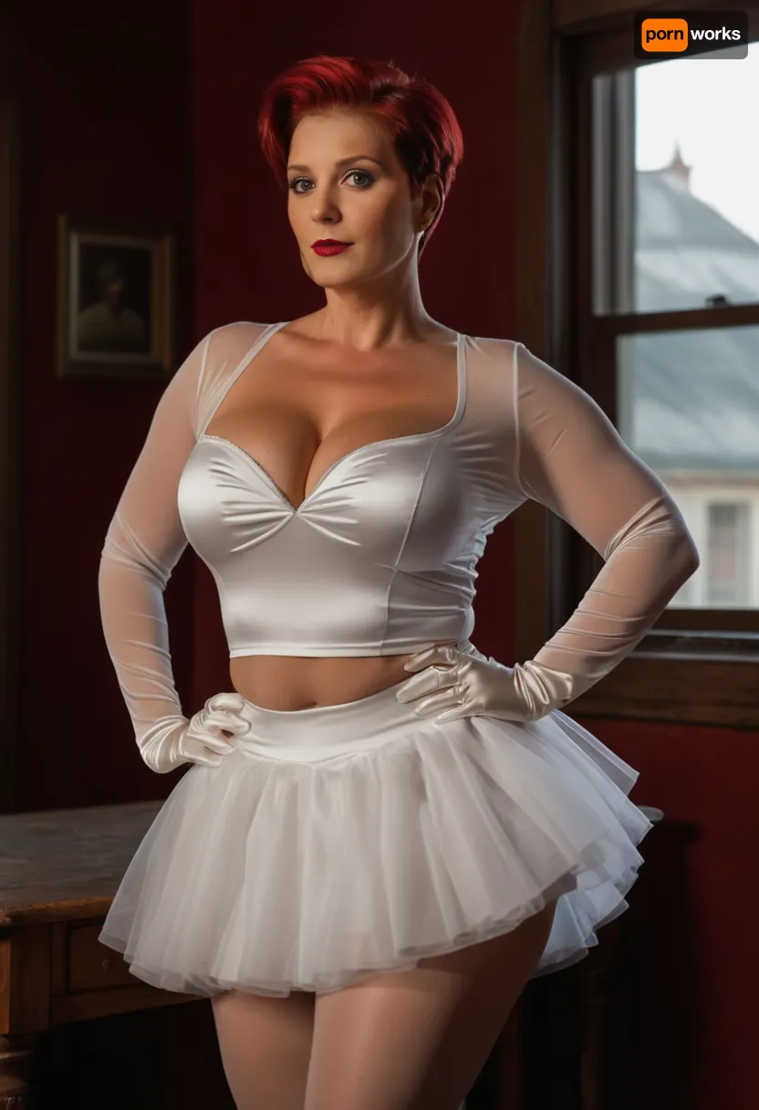 (RAW photo), 4K, best quality, realistic, photorealistic, masterpiece, extremely detailed, an extremely delicate and beautiful, dynamic, realistic anatomy, great lighting, perfect shading, professional shading, depth of field, 3/4 body view, curvy soviet mature woman, ((completely clothing)), (((outfit 02, white tutu skirt, white satin blouse, white satin gloves, transparent pantyhose, White satin panties))), ((chubby women:1.2)), (((red short undercut hair, short hair, asymmetrical hair, shaved on the side))), 40 years old, perfect face, ((sad:1.5)), ((milf:1.6)), blue eyes, makeup, red lipstick, standing in abandoned house, ((looking on viewer)), Photography, stvmccrr, style
