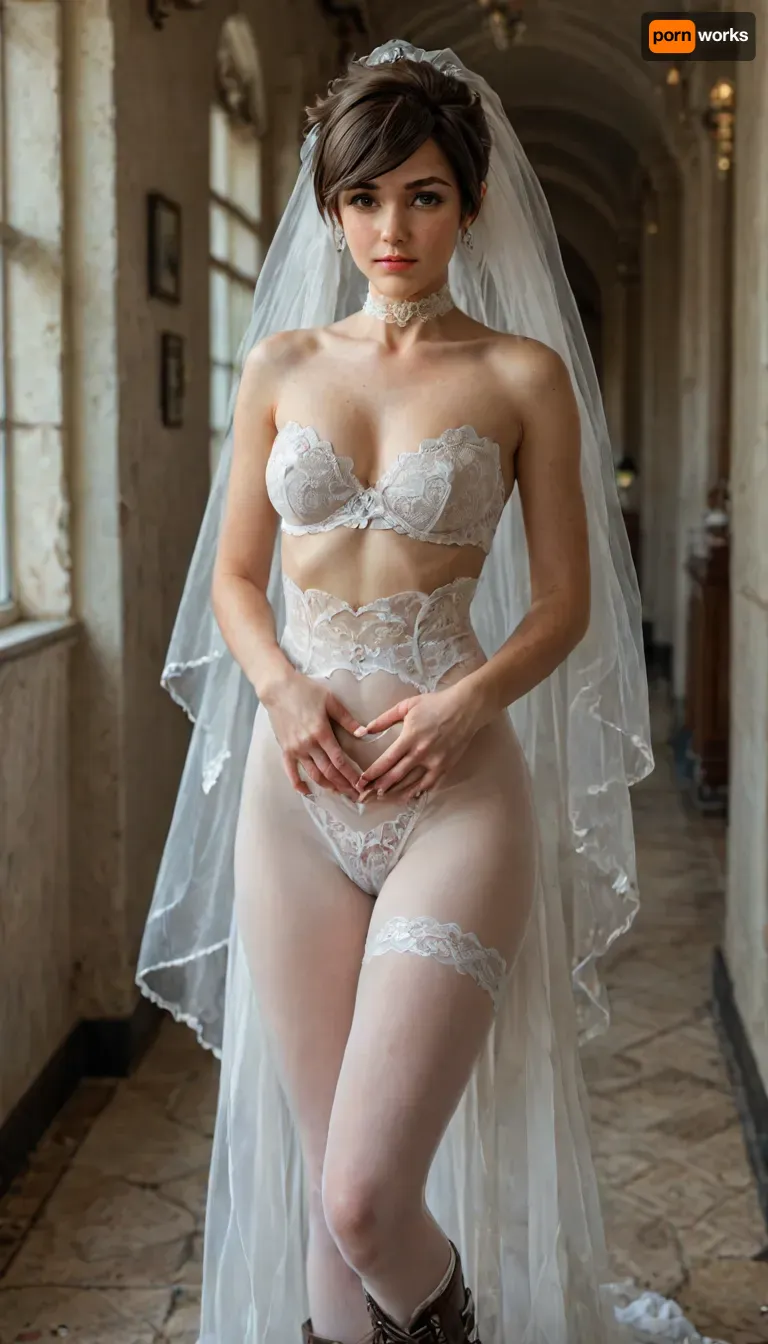 Super realistic 8k style, score_9, score_8_up, score_7_up, FILM PHOTOGRAPHY STYLE, cinematic photo photo woman, professional portrait photography, tracer from overwatch, naked, tight_fitting lace wedding dress and wedding veil, stomach_cutout, white knee-high leather boots with turn-up collar, white pantyhosed, extreme cameltoe, <lora:detailed_notrigger:1>, <lora:add-detail-xl:.8>, <lora:LCMTurboMix_Euler_A_fix:.8>