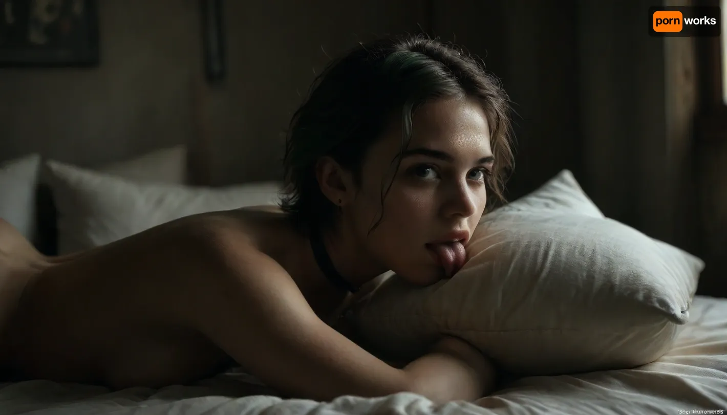 She is lying in the bed, (face pressed into a fluffy soft pillow), 1.8, shoulders and head on the bed and ass raised in the air, naked, stunning, waiting patiently for the viewer, skinny hips, thin and lithe body of a yoga instructor, (a slight excited smile with an expression of sleepiness mixed with eagerness mixed with a ritualistic readiness to be fucked any time you are ready), 1.5, breathing heavy, (very short pixie cut asymmetric emerald green hair), highly detailed hair, highly detailed green eyes, freckles, nice teeth, skinny waist, small a-cup tits, cute, aesthetics., pale skin, raver girl body, emo, round head, petite waist, wearing a leather choker on her neck, leather straps on her wrists and ankles, close up on, full body visible, random pose with proper light, proper shadows, very realistic pussy, very realistic anus, ultra detailed skin, <lora:MJ52:.9>, <lora:add-detail-xl:.5>, <lora:Randommaxx_dark_offset_v1.1_lora_fp16:.6>, moonlit, ultra detailed, hyper realistic and detailed faces and emotions, <lora:dark:.5>