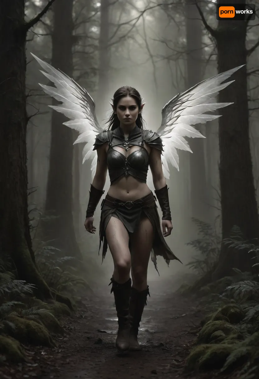 A breathtaking sexy 25-year-old female woodland runner, inspired by the character of Strider from Tolkien’s universe. She is half nude dressed in earthy tones and leather in a hot style, exuding a mystical and sexy aura as she moves gracefully through a Tolkien-inspired forest. In the distance, elven structures hint at ancient magic. The atmosphere is magical and mysterious, with dramatic lighting and soft ground fog, yet the scene remains warm and inviting. The woodland runner is not armed like a warrior, but is confident, self-assured, and incredibly beautiful, blending seamlessly into the enchanting forest environment, hvrn, heavy, rain, Black, and, white, art, black, shading, charcoal, toned, brutal, dark, b/w, color, scheme, haze, elven, architecture, face, mask, girl, scar, wings, glowing, armor, <lora:Heavy_Rain_XL-000008:1.8>, <lora:Black and white art.V1:.5>, <lora:EnvyHazeSliderXL01:1.9>, <lora:EnvyElvishArchitectureXL01:1.9>, <lora:Clariss_The_Hot_Cyber_Warrior-000009:1.8>