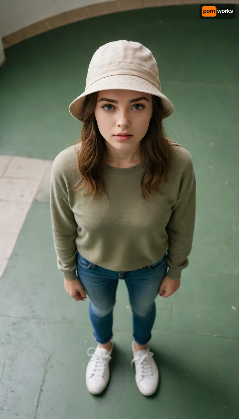 A cinematic top-down portrait of a young woman standing on a solid deep green floor, captured from an extreme overhead angle. She looks up directly at the camera with wide, expressive eyes, creating an intimate and slightly surreal mood. She wears a soft white bucket hat, a cozy oversized green-and-beige checkered sweater, blue jeans, and white sneakers. Minimalist composition with vast negative space surrounding her, emphasizing isolation and calm. Soft diffused studio lighting, natural skin tones, subtle shadows, clean color grading with earthy greens, editorial fashion photography style, ultra-sharp focus, high resolution, modern aesthetic, cinematic framing, shot on a professional DSLR, shallow depth of field, Instagram poster vibe