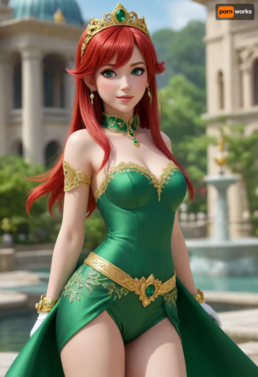 Carrion anímate, caricature, mood princess Pixar by 3d cgi model anime atyle, on her back, legs in the air, (pettite:1.5), (god lots of various princess cgi genshin impac Styles, in the background, A beautiful anime princess from a mobil video game with vibrant red hair and short, straight bangs. She has large, big green eyes, a small nose, and a delicate mouth. She wears an elegant lace rubí/emerald green silk outfit with intricate gold embroidery. On her head she wears a golden royal tiara with a large sparkling ruby in the center. She is strolling through the royal gardens and squares of the kingdom of Abul State, surrounded by marble fountains, exotic flowers and fantastic architecture under caatle, cinematic sunlight. 4k 3D quality, high-end video game concept art style. Lengerie Golden bright Video game concept art, anime style, princess with long red hair and bangs, large emerald green eyes, petite facial features, royal green dress with golden ornaments, golden crown with a central ruby, walking through Abul State kingdom gardens and plazas, lush vegetation, fantasy architecture, soft cinematic lighting, vibrant colors, highly detailed, 8k, masterpiece, magic particles in the air), sinonggo, sinonalo, sinonsolus, dsshino, logo of alchemial story
