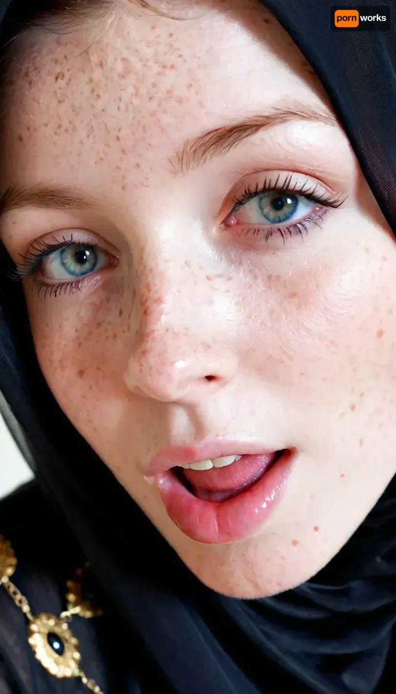 18 years old very sexy pale skin freckled burka girl, eye winking, sweet face, very close shot