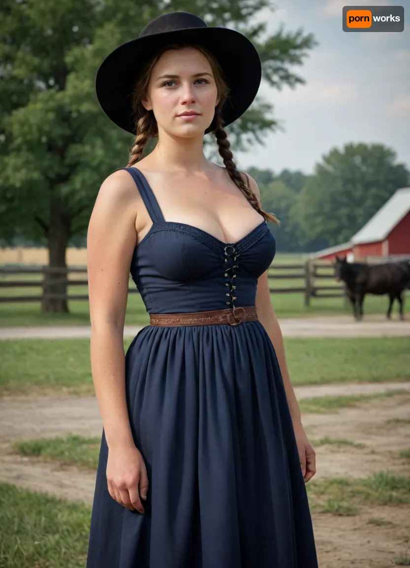Half-naked Amish busty woman, traditional amish dress, farm outdoor, hyperrealistic