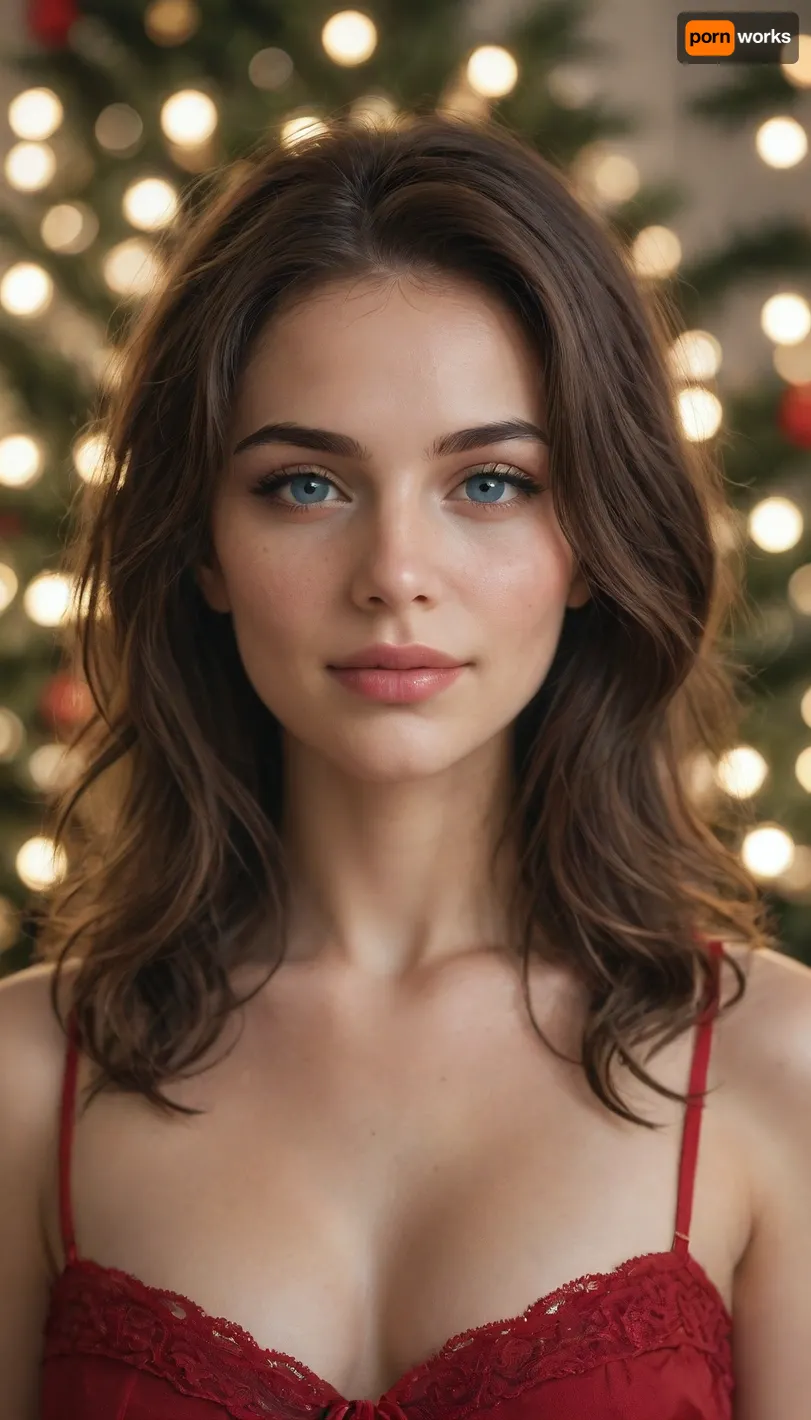 Extreme close-up portrait of a beautiful young woman named Vanessa with shoulder-length wavy brown hair softly framing her face, light blue eyes sparkling with joy, soft natural makeup, delicate feminine features, and a bright genuine warm smile looking directly at the viewer with playful teasing energy. Subtle festive Christmas atmosphere in the blurred background with hints of warm fairy lights and a decorated tree bokeh. Soft natural daylight illuminating her skin, high detail on facial features, eyes, lips, and expression, realistic photography style, professional beauty shoot, sharp focus on face, shallow depth of field, 8k resolution