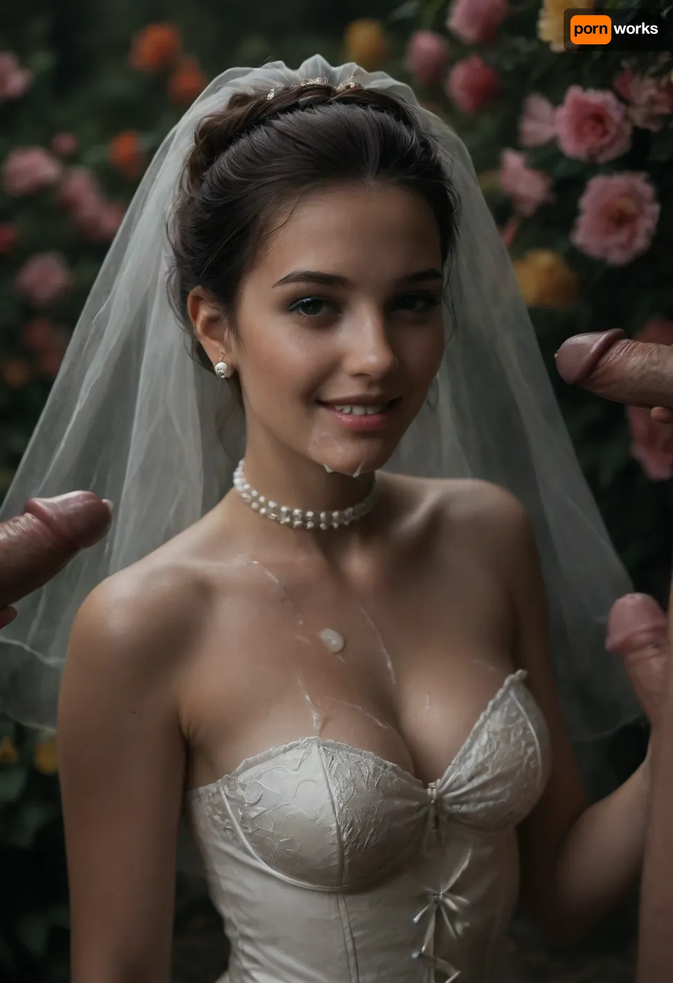 high resolution, high quality, dark scene at night, closeup of face, cute woman, cum on face, smile, pearl choker, pearl earrings, (Hair in elaborate updo:1.4), (((four loads of thick visible cum on her face:1.6))), cum dripping from face, cum on cleavage, (standing model posing, (wedding dress:1.2), (white corset:1.2), (wedding veil:1.3), (white lace gloves), cum is thick and white and clearly visible, exaggerated amounts of cum, very cute, smile, surrounded by cocks, out of focus colorful flowers in a romantic outdoor background, outdoors, on, face, bukkake, cum), bellissima, astonrichardsxl, woman, cum, on, face, <lora:LesFemmesXL_v1.0:1.5>, <lora:dark:.4>, <lora:astonrichardsxl:1>, <lora:JustCum:1.4>