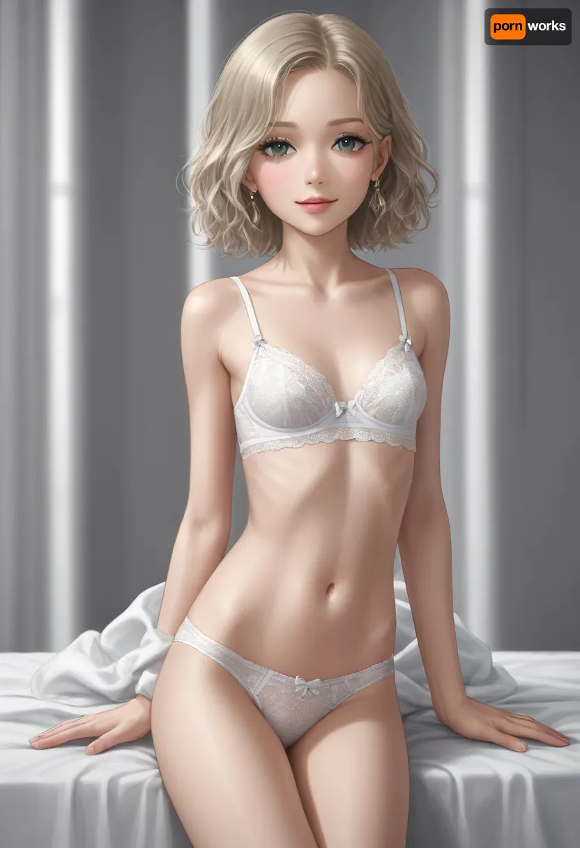 The image shows a young woman with medium dirty-blonde hair, smiling. She is wearing a white silk and lace bra and panties set. Graceful, slender, sculpted legs. skinny and anorexic body, The light falls on her, creating soft lighting. young, fresh faced, just out of school