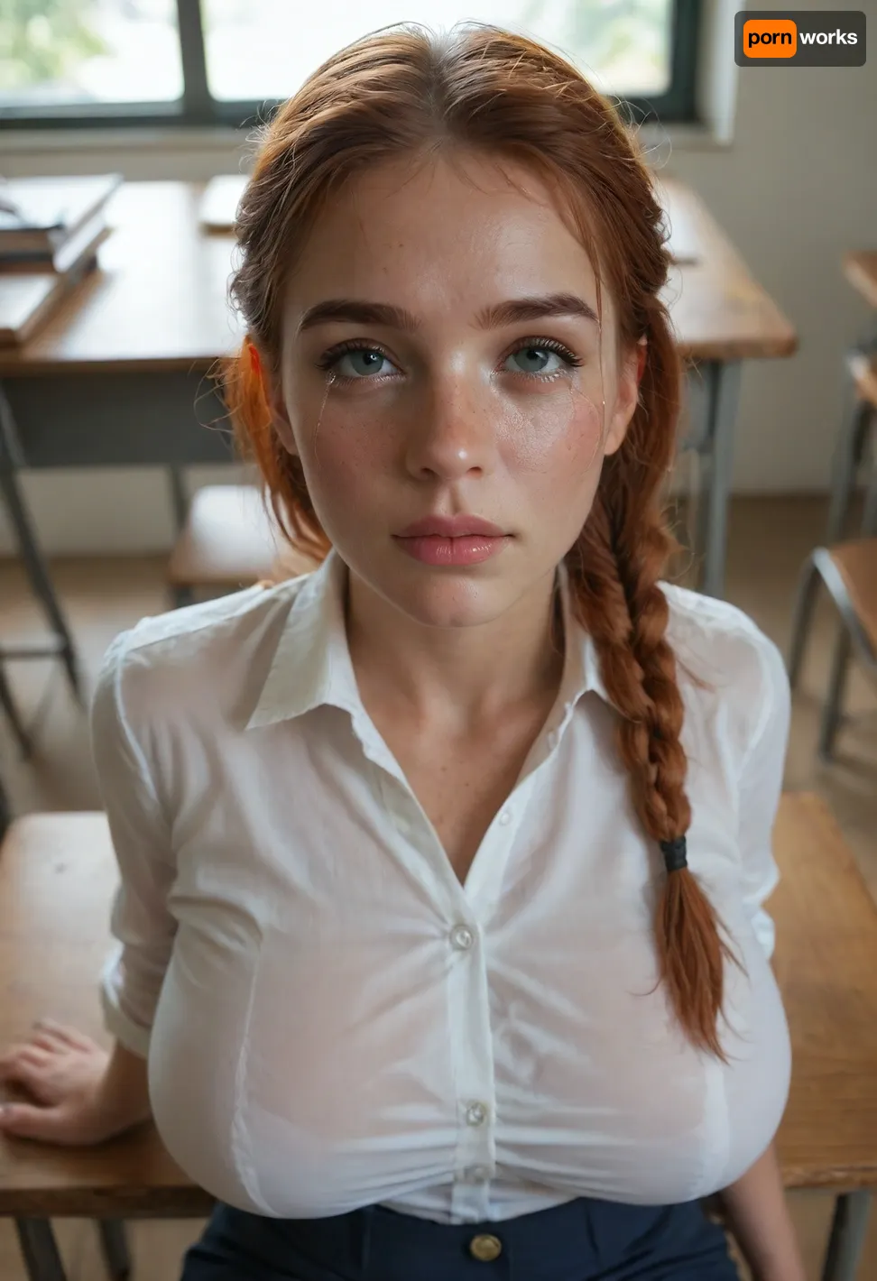 Classroom, dimly lit, 18 yo student, sitting at her desk, very busty, looking up to viewer, she is very busty, she is insanely beautiful, freckles, irish, long ginger braided hair, ((tight white school shirt)), ((bursting buttons)), ((big firm round breasts)), ((crying)), ((very close view from above)), ((view from very high angle)), ((very close focus on face and tits))