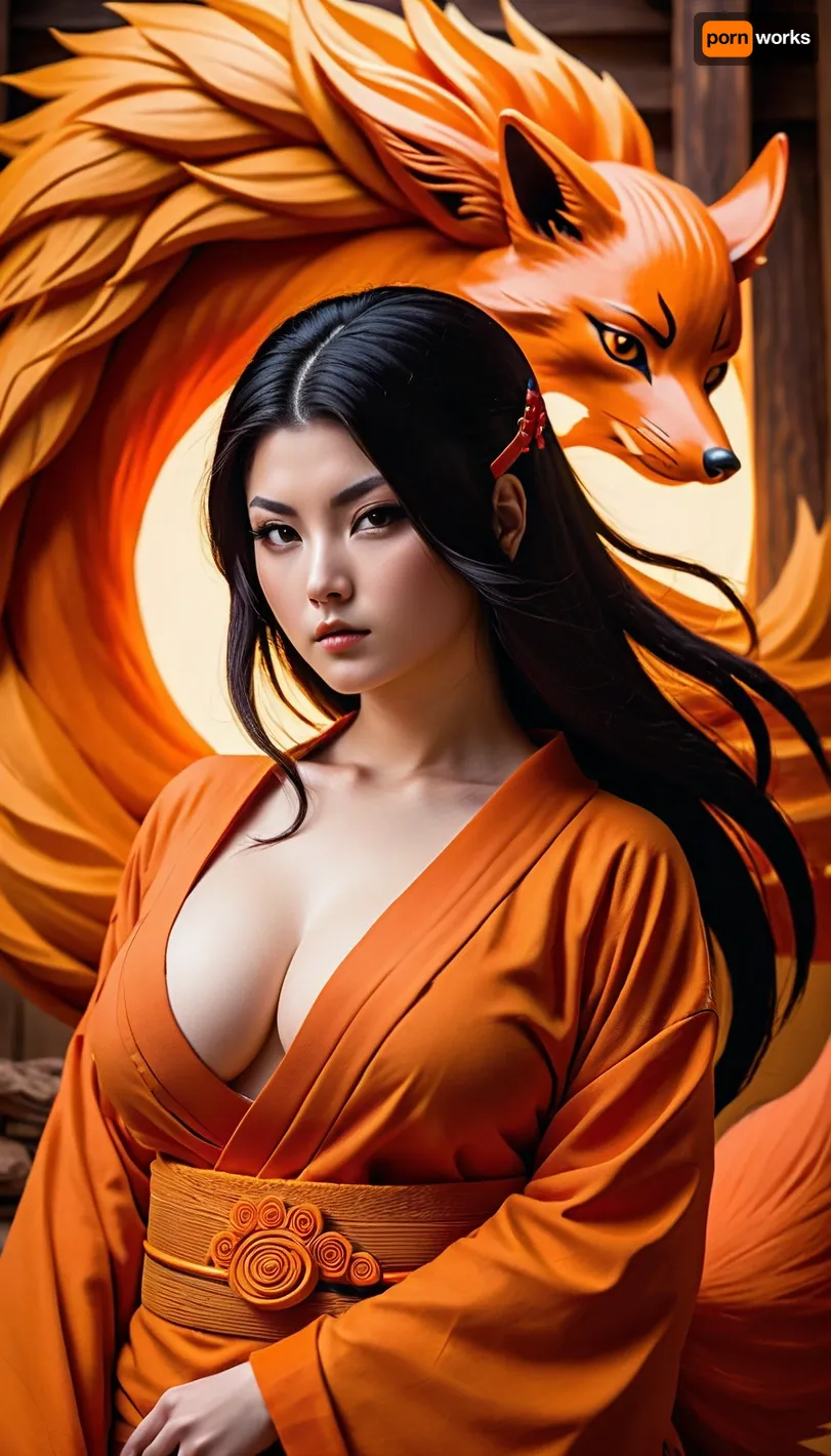 Chubby woman, white skin, long black hair, medium breasts, shaved vagina, (((she is a sensual version of Kurama, the nine-tailed fox from Naruto))), shuriken, daggers, ninja weapons. High-quality, highly detailed, cinematic, 8K, HD photo, a masterpiece. Perfect digital art.