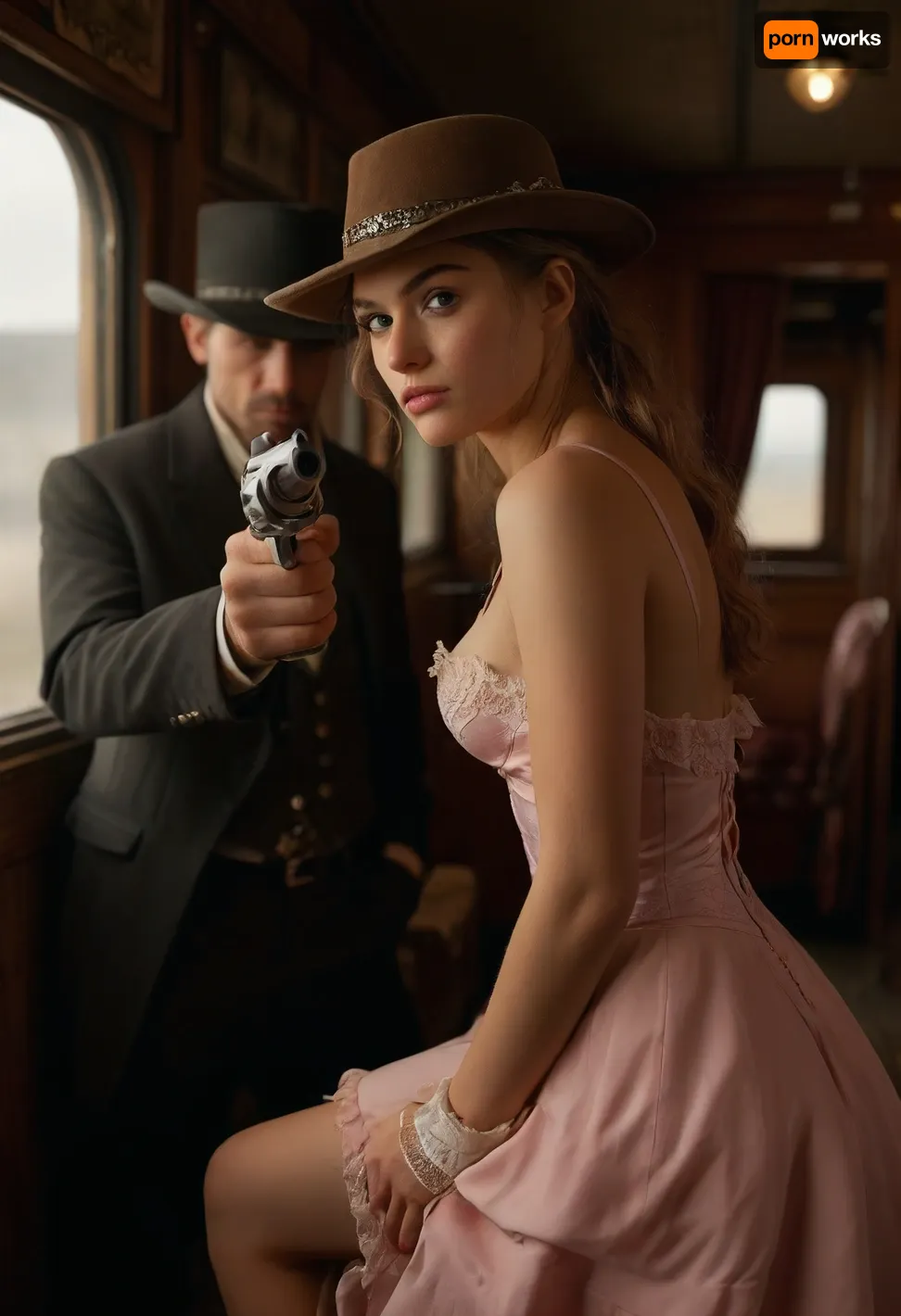 1female, 1male, Create a photorealistic, high-resolution, (robbery scene inside a late 19th-century Wild West train:1.5), In one compartment, a young woman lifts her dress and exposes her vagina while being robbed by a male dirty outlaw, she is 22 years old, sits delicately in a pastel pink dress, pink pussy, wearing white silk gloves. She gazes to a male unkempt outlaw, a 35-year-old male outlaw, exuding a dangerous and seductive aura, he’s clad in a rugged outfit, (with a revolver drawn:1.5), poised to rob the young woman, The contrast between the innocent young lady and the bold outlaw creates a dynamic tension in the scene. The train’s interior should be richly detailed, highlighting the textures of their clothing, the tense atmosphere, and the contrasting personalities., focusing on the textures of her clothing, the elegance of her accessories, and the dynamic atmosphere inside the train, (maximum detail), (super realistic photo:1.4), cloudy, smoke, atmospheric, clouds, fog, panties, pulled, to, side, pussy, shaved, QuarterCup, <lora:MJ52:.6>, <lora:Cloudy_Style:.8>, <lora:Pussy_pants_nohands_D03_realvizXL2_bucket_01-000010:1.4>, <lora:QuarterCupXL:.8>