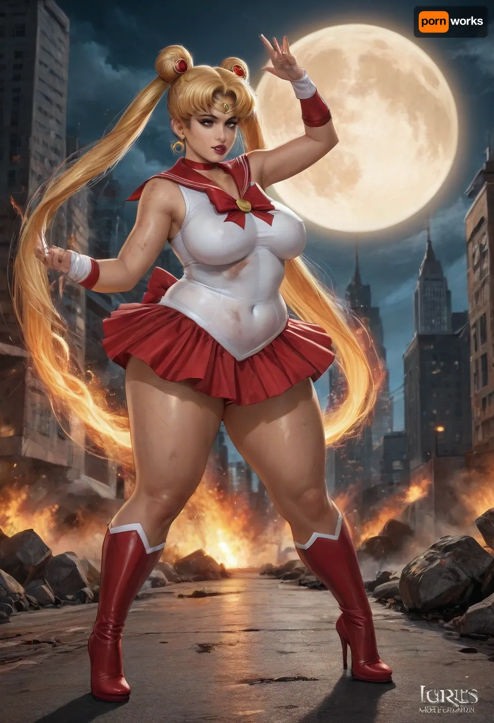 solo, side belowe view, full body view, ((Sailor Moon)), obese, saggy boobs, nipple bulge, angry, (sailor moon outfit), bloody scratches on skin, wounds, ready for fight poses, city, big moon, skyscraper, explosion, fire, (reiq artstyle)