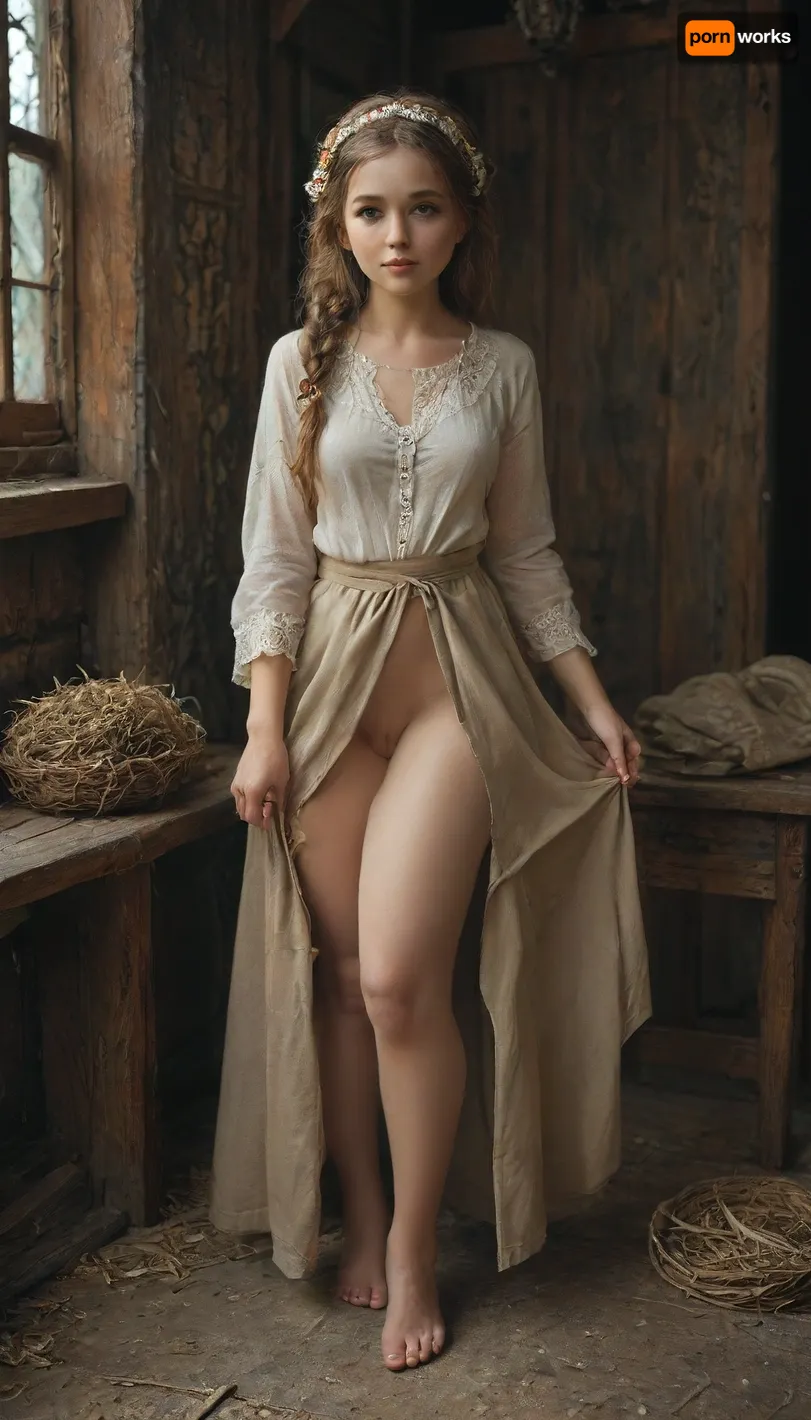 medieval England, a village, into old hut, a beautiful slender mature milf, 40 year old, full-length image, peasant woman in a knee-length white linen shirt with a straight slit in the front and a turn-down collar, with wide sleeves without cuffs sewn in with gusset inserts, The sleeves of the shirt are decorated with bright embroidery at the bottom, long, narrowed at the wrist with stitched small folds, a woman wears a long dark skirt over the shirt and a light knee-length apron. The skirt gathers at the waist and is trimmed at the hem with bright braid, the apron is also decorated with braid, over this she wears a dark sweatshirt with long sleeves and a low neckline, fitted at the waist, a fringed shawl on her shoulders, Her head is covered with a scarf, her ginger hair is curled into temple braids, intertwined with wide ribbons, barefoot, skindentation, small breasts, ass, dark, chiaroscuro, low-key, <lora:zavy-cntrst-sdxl:.5>, <lora:Chubby BBW - XL:.5>, <lora:tbh45-sdxl:.6>
