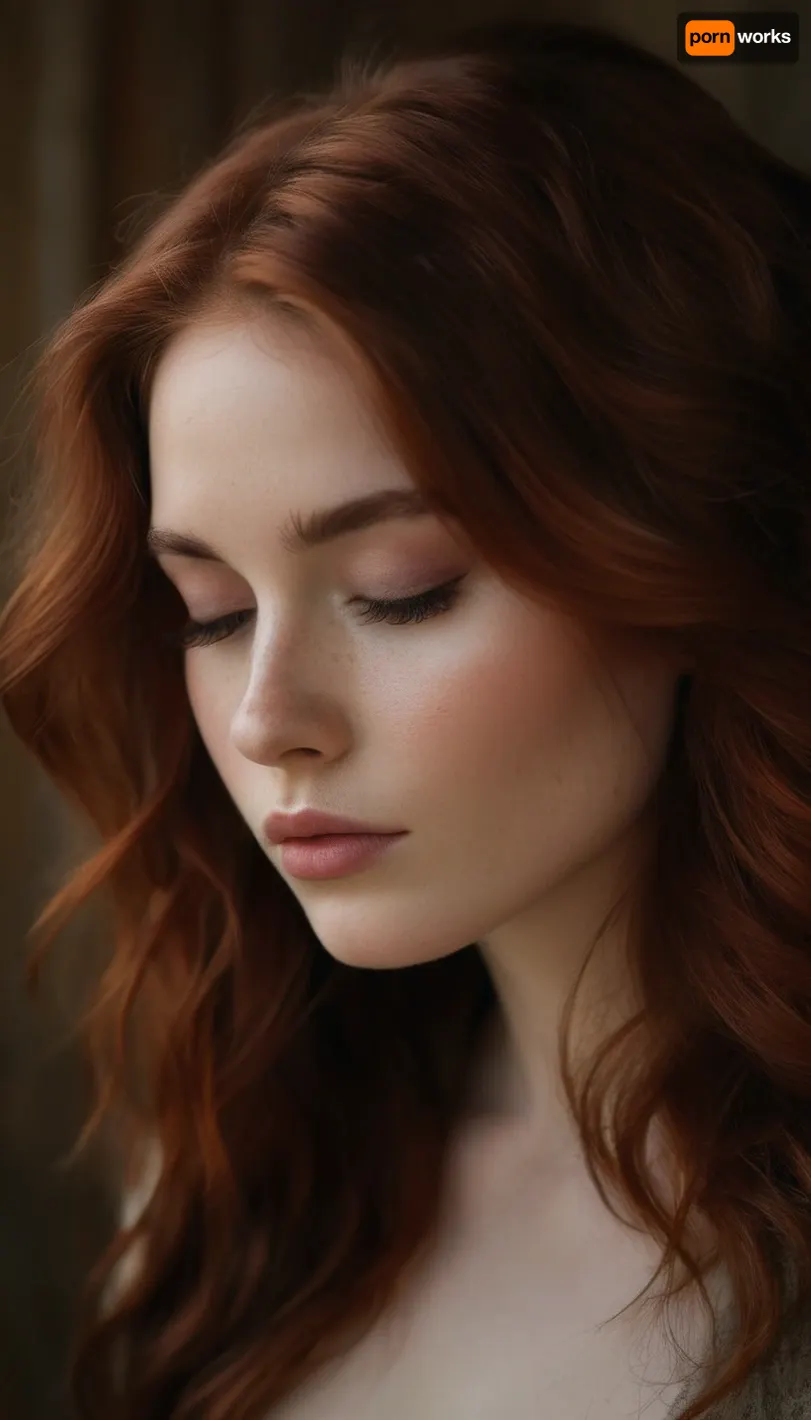 ziprealism, (sensual upper body portrait, intimate nude study, inn profile, young woman, pale skin, subtle freckles), (stylish vibrant auburn hair with dark roots, hair styled in textured layers, coppery highlights, voluminous hair, long delicate eyelashes:1.4), (serene and peaceful expression, raised face, dreamy esthetic, ethereal quality:1.6), (large expressive eyes, soft features, full lips, lips parted, soft pink lips:1.2), (large natural breasts, soft breasts, pale breasts, large areolas), (cinematic lighting, color grading, dappled light, shadowplay, rule of thirds, three quarters view:1.4), Stable-Yogis-Makeup-Enhancer-XL, ponychar3-RBSYPV3, <lora:ponychar3-0-RBSYPV3:.8>