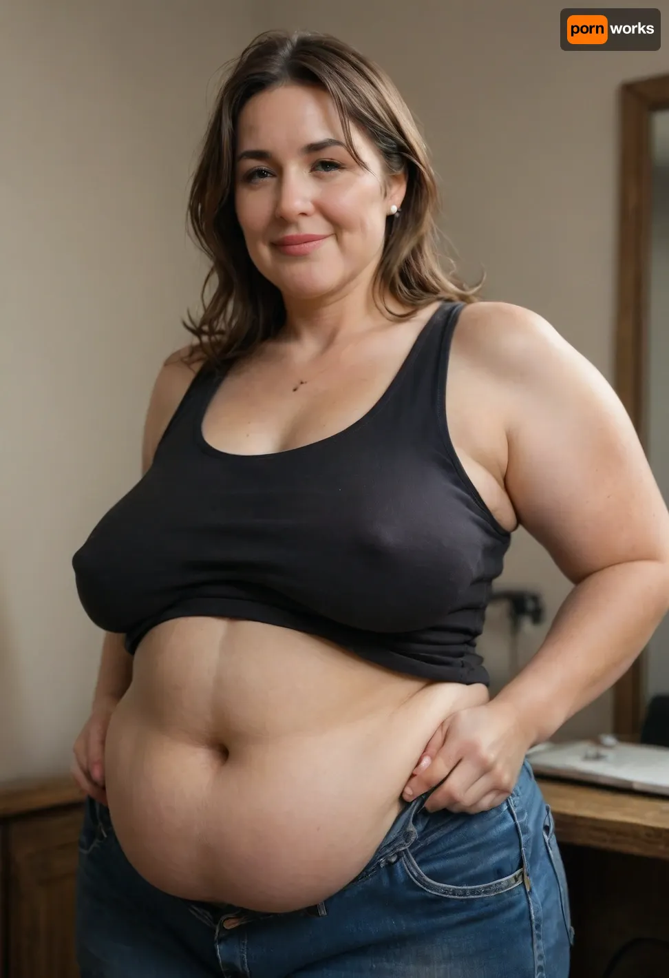 (masterpiece, best quality:1.2), very plus-size 1 gilf, (((ssbbw))), ((sagging bosom)), (mature:1.5), 60yo milf, solo, blue jeans, (long black tank top, no bra, braless:1.2), pretty eyes, thick brown hair with highlights, bright green eyes, grey in hair, smiling, photorealism, perfect face, portrait, braless, Wearing, clothes, that, make, sense, with, fat bbw, body wrinkles, plump belly, shapeless, saggy, (old breasts, hanging deep, heavy boobs, saggy old boobs, teardrop shaped breasts, covered erect nipples), highwaist blue jeans, Braless>, medium breasts, megachubsdxl, morbidly, obese, <lora:bralessSDXL_v1_00022:.7>, <lora:megachubsdxl_13:.3>, <lora:style_lora_realis:.8> (masterpiece, best quality:1.2), very plus-size 1 gilf, (((ssbbw))), ((sagging bosom)), (mature:1.5), 60yo milf, solo, blue jeans, (long black tank top, no bra, braless:1.2), pretty eyes, thick brown hair with highlights, bright green eyes, grey in hair, smiling, photorealism, perfect face, portrait, braless, Wearing, clothes, that, make, sense, with, fat bbw, body wrinkles, plump belly, shapeless, saggy, (old breasts, hanging deep, heavy boobs, saggy old boobs, teardrop shaped breasts, covered erect nipples), highwaist blue jeans, Braless>, medium breasts, megachubsdxl, morbidly, obese, <lora:bralessSDXL_v1_00022:.7>, <lora:megachubsdxl_13:.3>, <lora:style_lora_realis:.8>