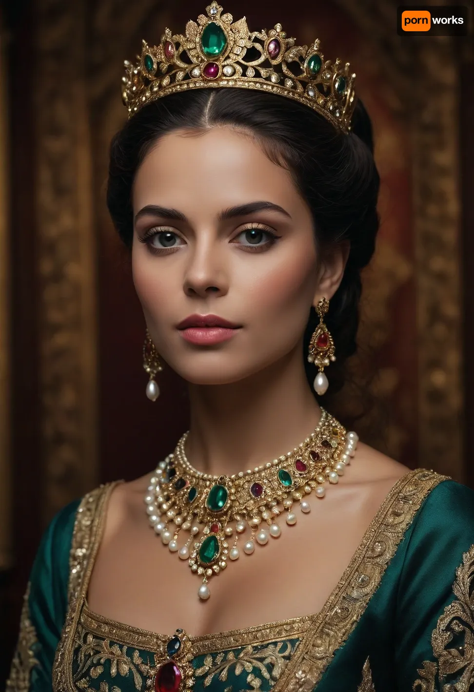 Create a highly detailed, realistic portrait of a regal woman inspired by the Queen of Saba. Focus on her upper body to showcase the opulent jewelry and clothing. Include large, natural pearls and precious gemstones like rubies, sapphires, and emeralds, intricately set in gold. Highlight the fine craftsmanship of the metalwork, with delicate engravings and filigree patterns. Pay close attention to the texture of the fabric, showing rich, luxurious materials, and ensure the gemstones sparkle with realistic light reflections. The overall composition should convey a sense of grandeur and cultural richness