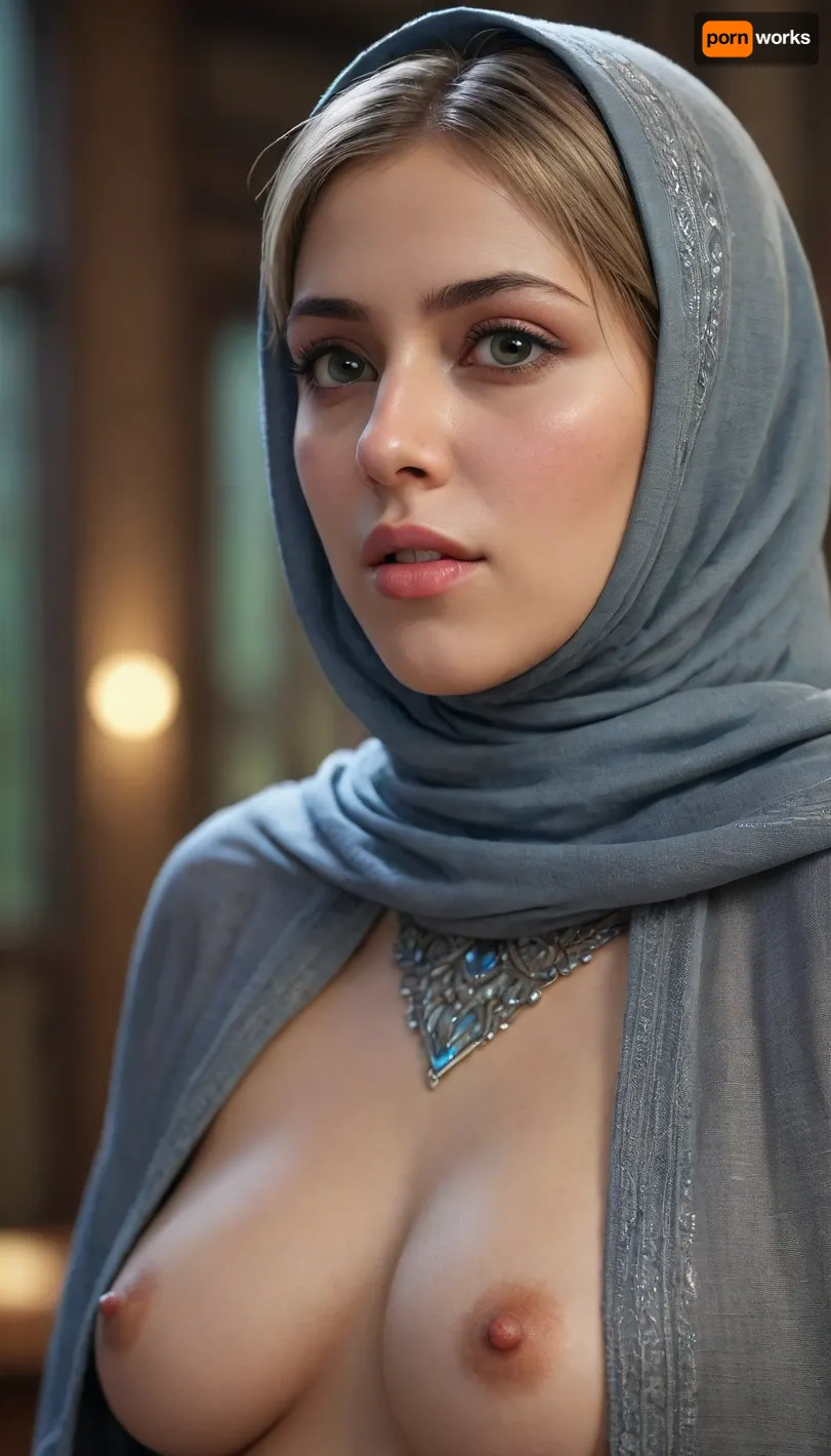 masterpiece, ultra-HD, cinematic lighting, photorealistic, impressionism, (1.5), high detail, depth of field, (blurred background), (dramatic lighting), best quality, very aesthetic, 8k, soft reflections, amazing composition, nia, (xenoblade), small breasts, petite, tiny breasts, facial, hetero, 1girl, (ultra HD quality details), wearing a-hijab, fashionable-hijab, hijab-burqa, grabbing, grabbing another's breast, nipples, 1boy, collar, head_out of frame, parted_lips, slight blur