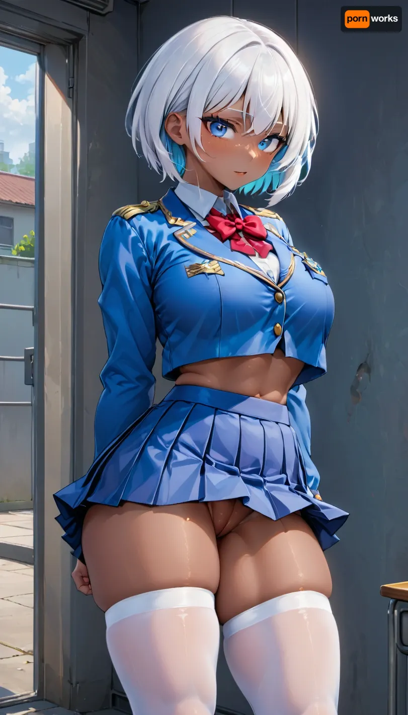 girl, schoolgirl, school, short white hair, huge tits, dark skin, athletic, white stockings, short skirt, blue uniform