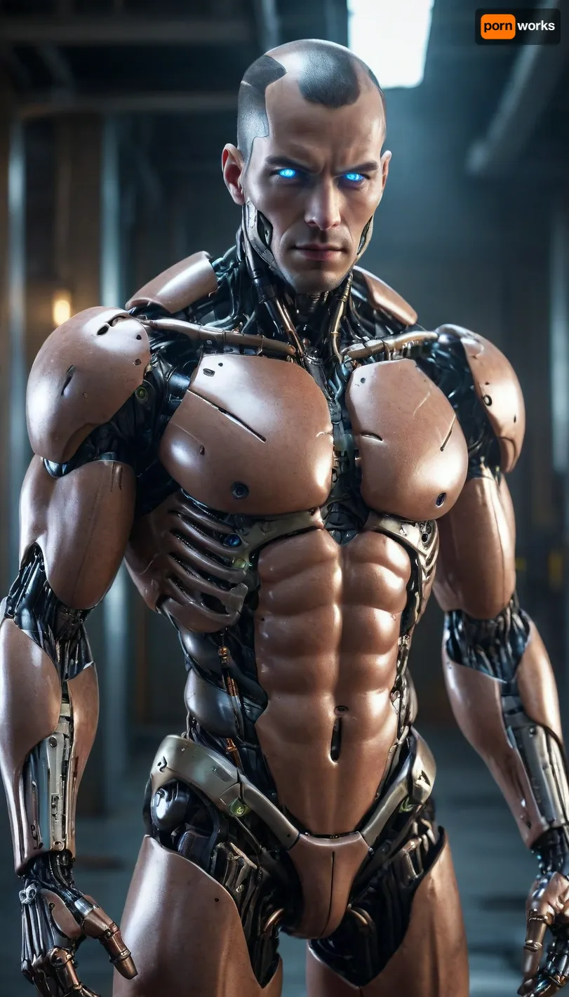 muscular male android, human skin on face, transparent robotic parts with glowing lights, mechanical body parts, guns in hand, fixed stare straight ahead, full body view muscular male android, human skin on face, transparent robotic parts with glowing lights, mechanical body parts, guns in hand, fixed stare straight ahead, full body view