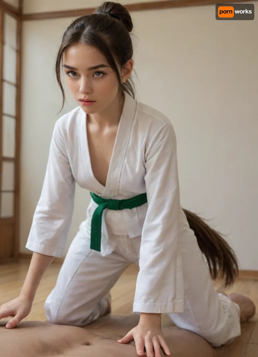 Tall 25yo woman with a wide face and long brown hair in pony tail wearing karate clothes with greenbelt and showing her small tits in doggy style and receives a creampie from a 40 year old man from the front in white karate clothes with blackbelt, in a karate dojo, flat, chested, <lora:flat_chested_v3.5:.1>