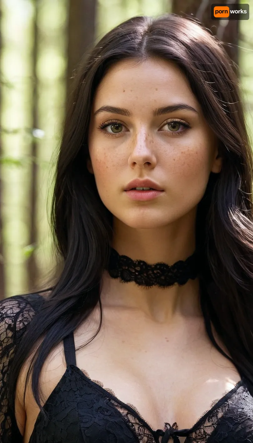 ((Girl 18 years old:1.5), tall and thin, with a thin waist and big tits, (Slavyanka:1.2), with long black hair and freckles, very beautiful, with attractive facial features and expression. She is dressed in sexy black lace clothes that accentuate her figure. Full-length to see the whole figure., (Close-up:1.1), but with the ability to see the entire figure, the emphasis on the face and upper body., (Cinematic lighting:1.1), With soft diffused light, using key light, contour light and fill light to create a volumetric effect. The contour light is directed at a 45 degree angle to the subject to create clear shadows and contrast., (Digital painting:1.1), with bright and saturated colors. In the forest, a natural background, but slightly blurred so as not to distract from the model. Best quality, masterpiece, high resolution with realistic details and textures.)