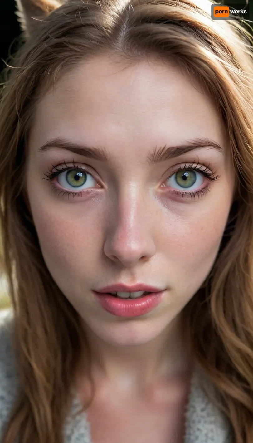 (selfie, portrait, face portrait with emphasis on her eyes, close up of face, fisheye lens:1.5), (dramatic high contrast rim lighting with sharp otherworldly shadows:1.8), (Scandinavian and Irish features), (photorealistic, photo realistic, photorealism, photo realism:1.8), (4k, 8k, 8k resolution, best quality, ultra quality, highest quality, maximum quality, uncompressed, raw source photograph:1.2), (same color eyes, symmetric eyes, matching eyes, detailed eyes, detailed iris, detailed pupils, limbal ring around iris, perfectly round iris, perfectly round pupils:1.4), (detailed skin, high detailed skin, intricately detailed skin, perfectly detailed skin, high quality skin, highest quality skin, exquisitely textured skin), (intricate clothing, detailed clothing), (microblade eyebrows, perfectly manicured eyebrows), (flushed cheeks, flushed neck, blushing cheeks, blushing neck), (her wide strong jaw highlights her powerful jawline, high cheekbones, sharp cheekbones, faint vellus hairs), (cute tall tall upturned button nose, delicate nose), (long messy hair framing her face, ginger hair with dark roots:1.3), (big eyes, wide eyes, doe eyes, slightly wide set eyes), (striking eyes, captivating eyes, mesmerizing eyes, glittering eyes, Fae eyes), (pale light green eyes with golden flecks), (large natural soft breasts, high breasts), (athletic body, sporty body, lean body, fit body), (she's in love, adoring gaze, loving expressing, adoring expression, joyous, joyful, pleased), (girlfriend, girlfriend material, girlfriend experience), (pale skin with freckled cheeks and nose, noticeable freckles), (facing directly into camera, head tilted slightly forwards), (female werewolf, pleasurable transformation from human to werewolf, wolf snout, wolf eyes, body covered in wolf hair:1.5), (full moon:1.2) (selfie, portrait, face portrait with emphasis on her eyes, close up of face, fisheye lens:1.5), (dramatic high contrast rim lighting with sharp otherworldly shadows:1.8), (Scandinavian and Irish features), (photorealistic, photo realistic, photorealism, photo realism:1.8), (4k, 8k, 8k resolution, best quality, ultra quality, highest quality, maximum quality, uncompressed, raw source photograph:1.2), (same color eyes, symmetric eyes, matching eyes, detailed eyes, detailed iris, detailed pupils, limbal ring around iris, perfectly round iris, perfectly round pupils:1.4), (detailed skin, high detailed skin, intricately detailed skin, perfectly detailed skin, high quality skin, highest quality skin, exquisitely textured skin), (intricate clothing, detailed clothing), (microblade eyebrows, perfectly manicured eyebrows), (flushed cheeks, flushed neck, blushing cheeks, blushing neck), (her wide strong jaw highlights her powerful jawline, high cheekbones, sharp cheekbones, faint vellus hairs), (cute tall tall upturned button nose, delicate nose), (long messy hair framing her face, ginger hair with dark roots:1.3), (big eyes, wide eyes, doe eyes, slightly wide set eyes), (striking eyes, captivating eyes, mesmerizing eyes, glittering eyes, Fae eyes), (pale light green eyes with golden flecks), (large natural soft breasts, high breasts), (athletic body, sporty body, lean body, fit body), (she's in love, adoring gaze, loving expressing, adoring expression, joyous, joyful, pleased), (girlfriend, girlfriend material, girlfriend experience), (pale skin with freckled cheeks and nose, noticeable freckles), (facing directly into camera, head tilted slightly forwards), (female werewolf, pleasurable transformation from human to werewolf, wolf snout, wolf eyes, body covered in wolf hair:1.5), (full moon:1.2)