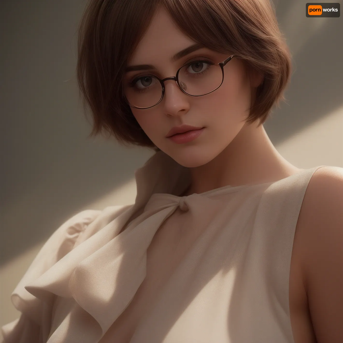 1girl Europian girl, looking at viewer, Full body view, 3D, realistic, a small delicate nose, soft rounded facial features, (but not chubby), large breasts, (tight cropped top), short gray skirt, brown natural hair, Warm eyes behind delicate glasses, messy shaggy Bob haircut, erect nipples visible through clothing, masterpiece, best quality, 8k, detailed skin texture, detailed cloth texture, beautiful detailed face, intricate details, ultra detailed, rim lighting, side lighting, cinematic light, ultra high res, 8k uhd, film grain, best shadow, delicate, RAW, <lora:ShenHe_TongRen:.8>