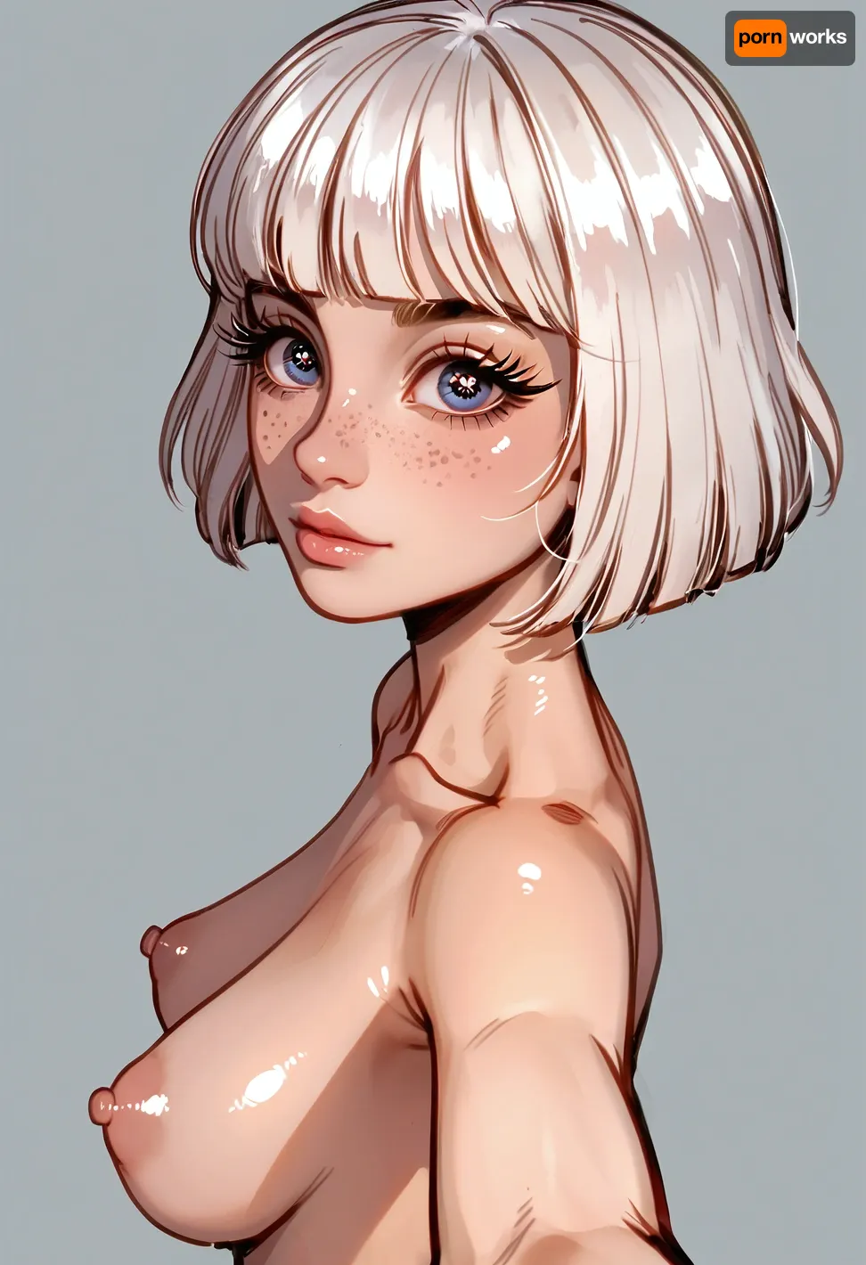 1girl, white hair, freckles on face, (skinny), (big space eyes), short hair with fringe, (((big long eyelashes))), freckles, (moles pimples spots all over body), alone, topless, (puffy nipples:.6), (best selfie pose), pretty face, portrait, standing, big round eyes, top view, (side view:1.4), (((shiny shiny tits))), (Long big conical tits), ratatatat74, <lora:ratatatat74-000050:1.5>, <lora:cartoon_stickers_xl_v1:.6>