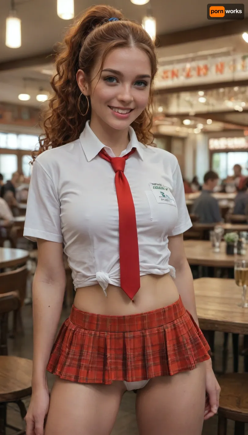 UHD 8K, extreme realism, maximum detail, (crowded restaurant:1.3), 20 year old athletic Irish redhead, long curly hair, ponytail, medium breasts, (revealing microskirt:1.7), (visible panty:1.6), (short-sleeved shirt:1.4), (tie:1.4), very attractive, smile, (not looking at the viewer:1.5), leaning on a counter