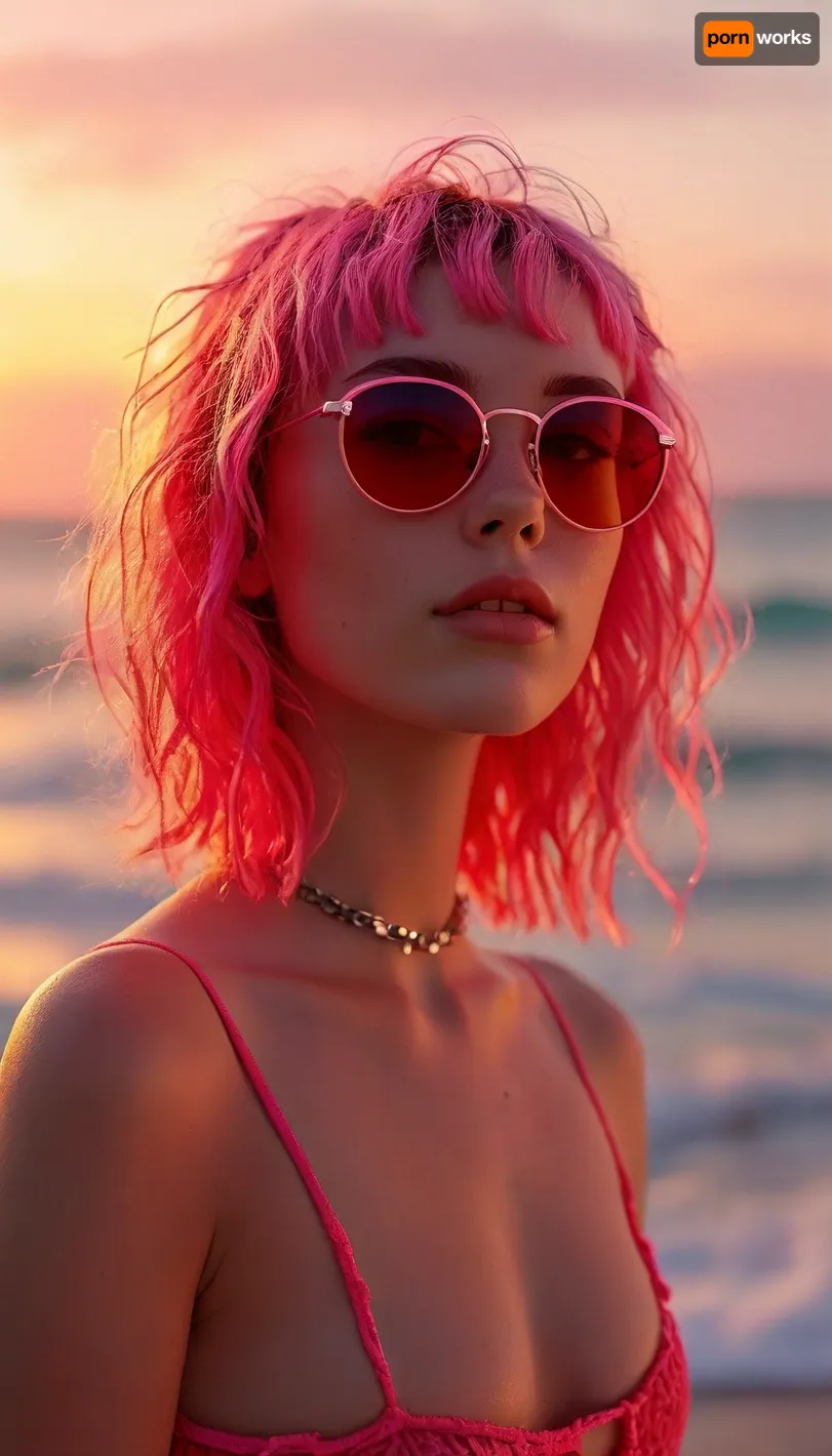 s1990's beach babe with stylish neon pink hair cut in textured waves, flirty, playful, sunglasses, vaporwave sunset color theme, ziprealism, perfecteyes, sunnyrayyxo, <lora:MJ52:.8>