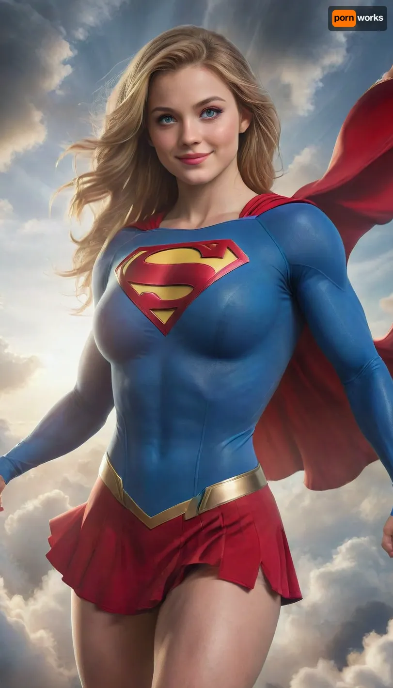 masterpiece, best quality, high resolution, hires, solo, close up, upper torso portrait, front, facing viewer, looking at viewer, huge breasts, lithe athletic body, hourglass figure, long hair, wavy hair, sleek golden hair, blue eyes, 19 years old, narrow face, charming smile, shiny blue skin tight long sleeve body suit with wide neck and red cape tucked into neck of suit, (red mini skirt with gold belt), (Superman Symbol on chest), muscular, supergirl, mad-abvthclds, clouds, cloudy, sky, sun, moon, 1girl, <lora:uberfit_lora_sdxl:.7>, <lora:f0f34de2-5e88-48a4-8ef5-e4e6c30adb6d.TA_trained:.5>, <lora:Above_the_Clouds_SDXL:.5>, <lora:PAseer-SDXL-FarOfTheSun:.5>, ohwx, woman, <lora:sydney_lora_sdxl_v1-000008:.5>