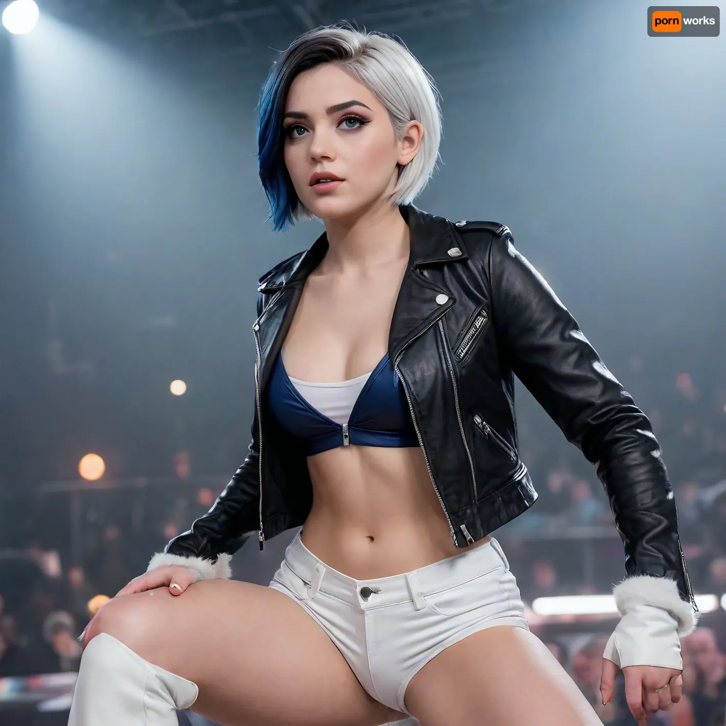Luna snow de marvel rivals, luna tiene 18 años de edad, cara hermosa, (ojos claros), (Big blue eyes), piel muy blanca, cuerpo completo., trasero grande, pequeña cintura, (((Short two color hair)), ((black hair)), (white hair)), .she is wearing a, (small black leather rocker jacket), small blue top, withe shorts, white boots, in a pop music concert snowing., <lora:580159_training_data:1.7>, <lora:668315_training_data:.1>, <lora:Microwaist_XL_v01:.7>