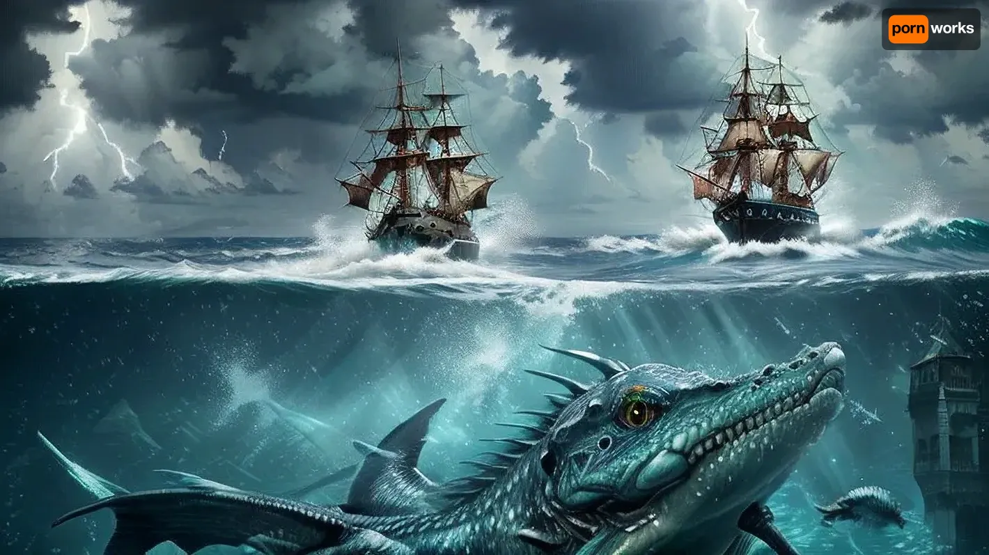 Seascape, ship on the high seas, storm, high waves, colored ink Mikhail Garmash, Louis Jover, Victor Cheleg, Damien Hirst, Ivan Aizovsky, Claude Joseph Vernet, broken glass effect, no background, amazing, something that doesn’t even exist, a terrible sea monster swims up to the ship, a strong storm, huge frothy waves, thunderclouds covered the entire sky, lightning flashes on the horizon, energy, molecular, textures, shimmering and luminescent colors, breathtaking beauty, pure perfection, divine presence, unforgettable, impressive, three-dimensional light, auras, rays, vibrant colors, Broken Glass effect, stunning, something that even doesn't exist, mythical being, iridescent and luminescent scales, Volumetric light, vivid colors reflects, sea, monster, undersea, boat, <lora:SeaMonster-v1.0:.5>