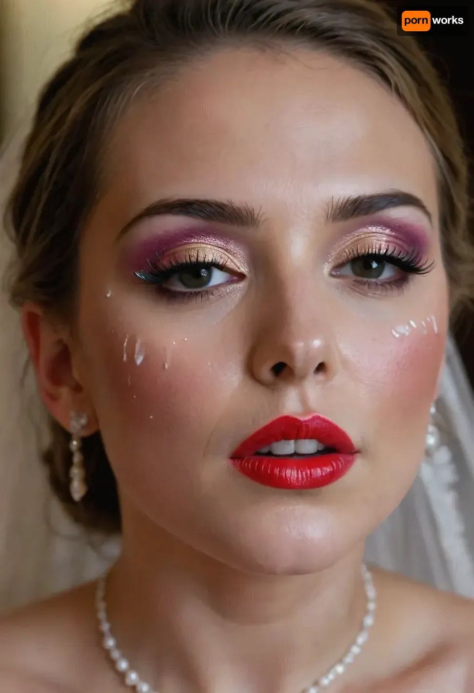 bukkake, cumshot, facial portrait picture of the Bride face in cum facial, with heavy colorful makeup and a lot of makeup, a lot of Cum on her face, cum on her long black eyelashes, Cum on her eyelids, Cum on her cheek skin, her face wet with Cum, Cum on her red lips. cum on her wedding tail., woman, cum, on, face, <lora:JustCum:1.3>