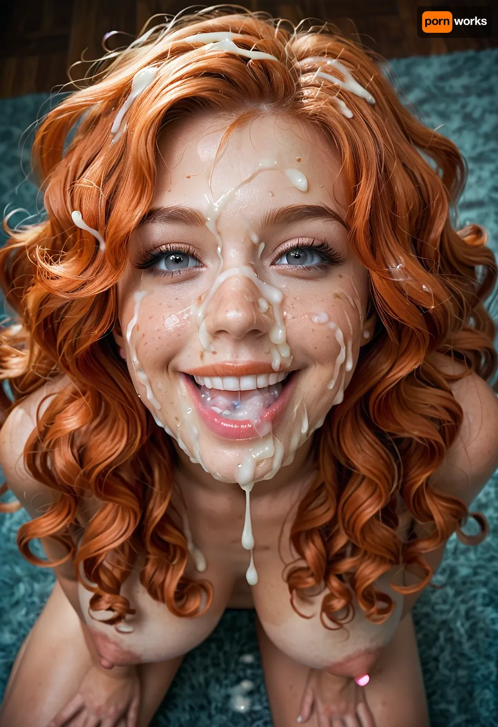 super close shot of bukkake, (viewed from above), happy open smile, hd dark and detailed grey eyes and iris, ((long wavy hair)), lots of long runny thick cumshots, facial portrait picture of her face in cum facial, with natural minimal makeup, (looking at viewer), a lot of Cum on her face and between her perky saggy pointy medicine pert breasts, huge perky puffy areola and nipples, cum on her eyelashes, Cum on her eyelids, Cum on her cheeks, her face coated with Cum, Cum on her pink lips. cum on her hair, cum in mouth, (ginger styles, aged 37, older, 37yo), woman, cum, on, face, <lora:JustCum:.9>