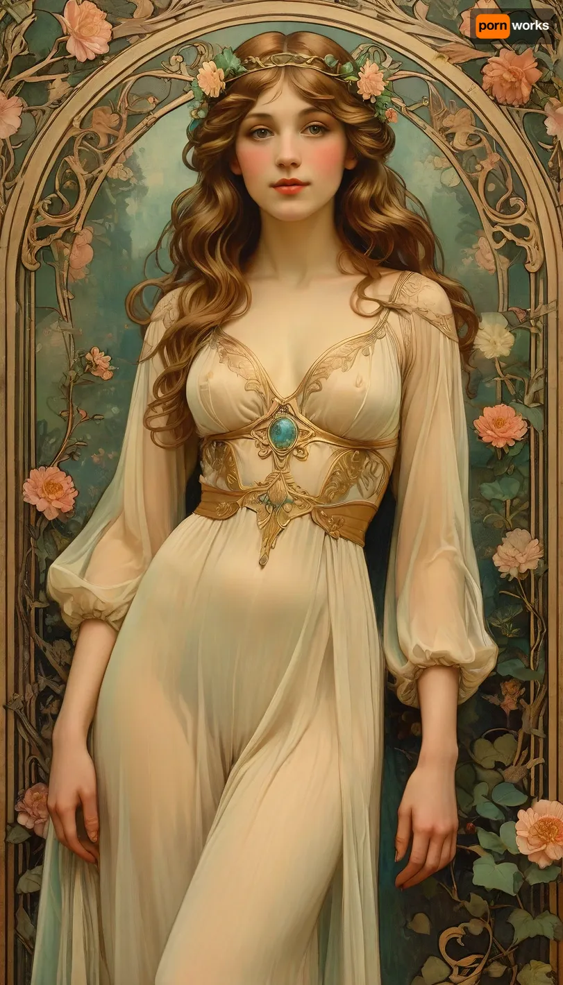 Rating_explicit, illustration of a beautiful woman in an art nouveau style garden, surrounded by blooming flowers and vines, semi-nude, dark triangular pubic hair, delicate floral crown, soft pastel colors, long wavy hair, serene and elegant expression, graceful pose, golden decorative elements around her, romantic and dreamy lighting, art nouveau background with ornate lines and natural curves, fine art photography, highly detailed, magical and ethereal atmosphere, soft focus on edges, style, of, Alphonse, Mucha, <lora:ac_neg1:.5>, <lora:tbh200-sdxl:.8>, ccxl-mucha, <lora:ccxl-mucha_lora_vA1:.8> Rating_explicit, illustration of a beautiful woman in an art nouveau style garden, surrounded by blooming flowers and vines, semi-nude, dark triangular pubic hair, delicate floral crown, soft pastel colors, long wavy hair, serene and elegant expression, graceful pose, golden decorative elements around her, romantic and dreamy lighting, art nouveau background with ornate lines and natural curves, fine art photography, highly detailed, magical and ethereal atmosphere, soft focus on edges, style, of, Alphonse, Mucha, <lora:ac_neg1:.5>, <lora:tbh200-sdxl:.8>, ccxl-mucha, <lora:ccxl-mucha_lora_vA1:.8>