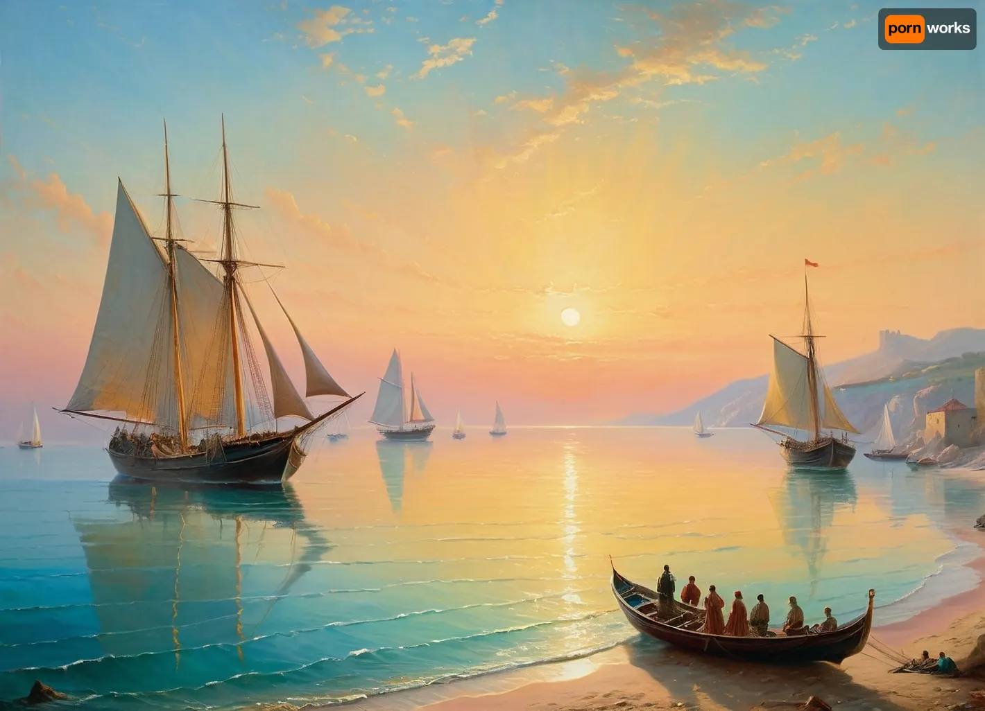The painting is in the style of the Russian artist Ivan Konstantinovich Aivazovsky.In the central part of the canvas there is a sailboat standing on a raid near the walls of the Genoese fortress. The rays of the rising sun turn the sails of the ship pale pink. The turquoise expanse of the sea is calm, and the unfurled sails are reflected in it, as if in a mirror. In the foreground of the painting, on a sandy beach near the sea, the viewer sees a cart pulled by two oxen and a boat approaching the shore. Near the cart and boat, the author depicted local residents dressed in national costumes. In the haze of morning fog, the outlines of sailboats standing in the bay are barely discernible. The rays of the sun rising over the mountains fill the sky, the peaks of the rocks and the sea near the horizon with a warm lemon yellow color. In the misty haze on the tops of the coastal cliffs, you can see the ancient towers of the ancient Genoese fortress. The painting is imbued with lyrical romanticism, which is especially felt on Aivazovsky's canvases, painted in the so-called oriental taste.