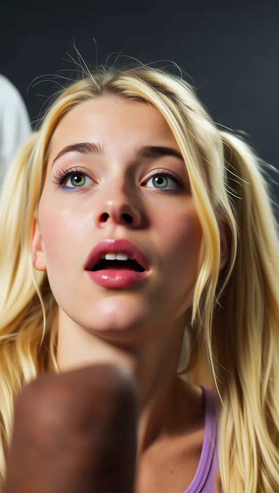 A flight attendant is sitting on an airplane in front of a man. Her face is completely covered with cum and some of the cum is on her neck. She she looks mad, She flips him off and moves away quickly. A massive amount of cum shoots out of the man's penis and lands on her face, drenching her in cum. The man is stroking his penis back and forth with his hand. The view is from the side. She has long platinum blonde hair, <lora:wan_cumshot:.5>