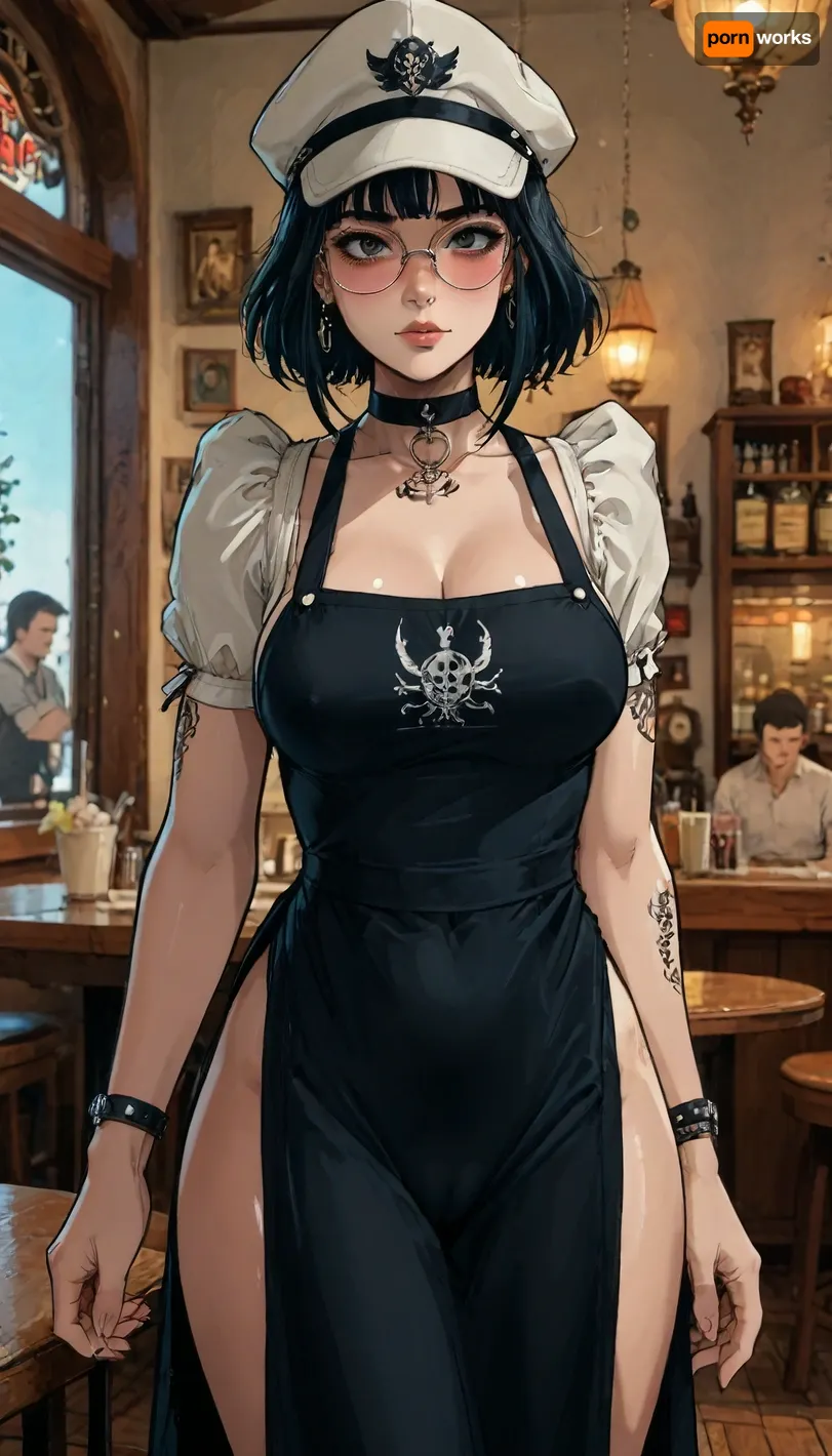 ((Markgavatino style)), reiq style, 1girl, pretty girl, blushing, goth make up, face piercings, nose piercing, tattoo, black long bangs, camel toe, round glasses, white cap, wearing a black apron, big cleavage, at cafe, (big tits:.7), ratatatat74, jtcstyle, <lora:加藤彩style:.9>, <lora:LCMTurboMix_Euler_A_fix:1.2>, <lora:ratatatat74-000050:2>, <lora:EnvyBeautyXL02:1>, <lora:mki-ani31-GenshinPV-v2-000012:1.8>