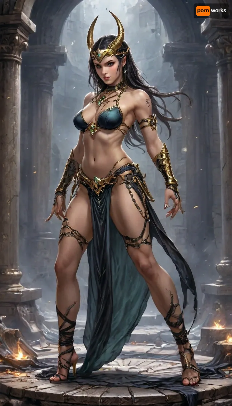 charactor card for TTRPG Guilded frame, Marvel comic Style Cover Art Concept for Elyndra, The Wind Vanguard, (photorealistic), World of warcraft art style Visual Elements, Main Character – jade an exotic dancer assassin, Central to the cover is jade, (world of warcraft art), Her long straight hair fell all the way down her back past her tight ass., (dynamic dance pose), It was as black as a raven's plumage, which only made her crystal blue eyes stand out that much more. Her eyeliner was dawn out almost like the eye of Ra and her lips were painted red. She wore a sheer jade color belly dancer lingerie with gold accents that jingled with every step she took. The top looked like a gold scorpion carapace just covering her breasts. Her stomach was bare other than gold chain jewelry and a green gem in her belly that pulsated with a sparkling glow lighting up a series of calligraphy runes on her skin. Her transparent jade loincloth flowed with the slightest move or step she took hanging off her hips showing off her tiny strappy thong. Gold chains decorates her arms and thighs as well. Her feet were dressed in sandals with straps, (comic book style), standing on a pile of bones and rubble, apocalyptic background, standing at edge of colossal underground abyss, glowing Hash-Nass hive below shaped like a malignant star, scale emphasizing inevitability and threat STYLE LOCK, (Epic dark fantasy illustration, mythic science-fantasy tone, painterly realism, Luis Royo inspired, dramatic lighting, high contrast, rich textures, flowing fabrics, ancient technology disguised as divine artifacts, cinematic composition, ultra-detailed, sharp focus, no modern elements, no text, no watermark), high contrast black and white, only one character, no horns, braided, Art, by, Boris, Vallejo, <lora:Mecha_Ggorgeous_Armor-000011:2>, <lora:Braided_Sides_V1:1.8>, <lora:Fantasy_art_XL_V1:1.4>, <lora:Granblue_Collection_XL_-_Heroes:2>, <lora:Dance_Art:.8>