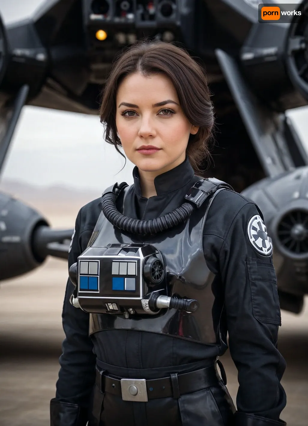 Professional photography, Sci-Fi, Star Wars galaxy, a female test pilot of the Galactic Empire from Star Wars, beautiful, wearing a black TIE fighter pilot jumpsuit, gloves on her hands, against the backdrop of a new model of a starfighter. Close-up. Detailed portrait. Natural lighting, high quality.