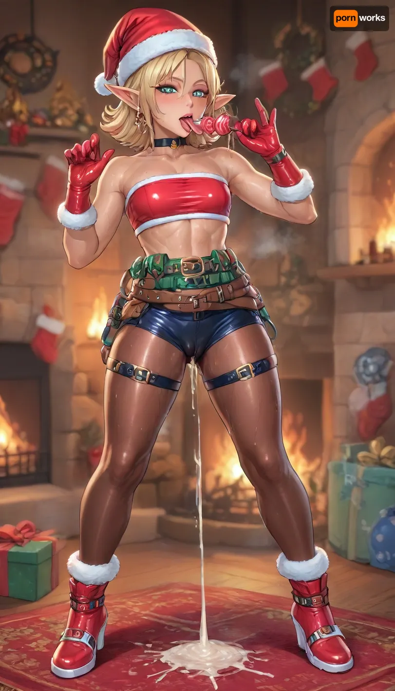 (reiq art style:1.1), (masterpiece art style:1.1), (beautiful muscular mito ikumi from shokugeki no souma:1.6), green eyes, blonde hair, short hair. tan line skinned, (gyaru skin:1.4), 1girl, solo, alone, muscular arms, sexy figure, and wide hips. muscular legs, thick thighs, round ass, (muscular body), (lustful face), (Christmas), (fireplace), (standing lustfully porn posing:1.4), (dripping droll licking a Christmas chocolate candy:1.3), (gear elf hat costume:1.5), (tight gear mini tubetop:1.5), (gear pantyhose:1.5), (gear Low Rise booty shorts:1.5), (gear gloves:1.3), (gear belt:1.5), (elf shoes:1.53), (camel toe:1.4), (sweaty dripping heavily off over body:1.3), (body Sweaty:1.6), (cum thick dripping coming excessive out of pussy:1.4), hardcore, perfect fingers, A masterpiece of the highest quality, the work of a real master, bouncing breasts, bouncing ass, seductive, seductive eyes, black choker, steam, sweat, full body in view, <lora:cartoon_stickers_xl_v1:.1>, <lora:hentai_anime_style_xl_v1:1.2>, <lora:nier2b_agnxl4:1.2>