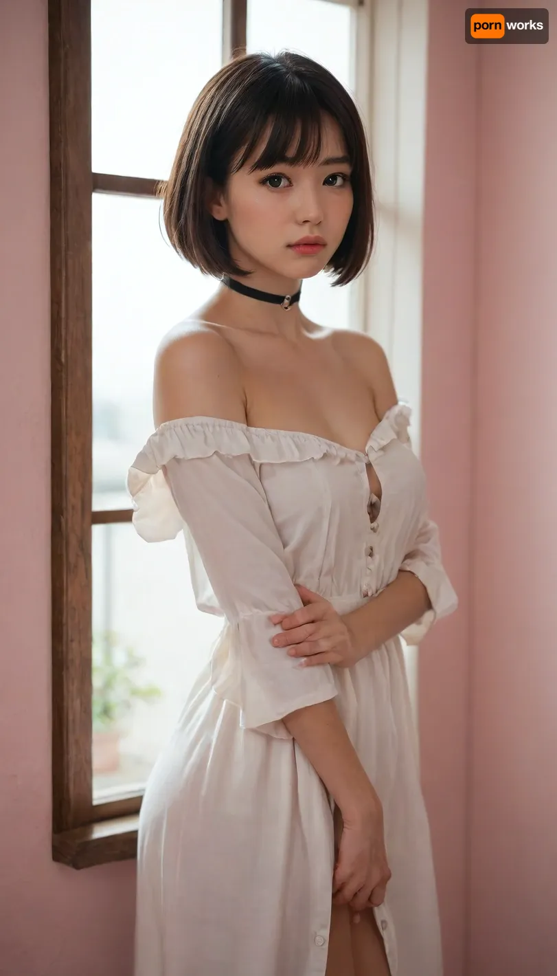 (dramatic lighting), masterpiece, best quality, very aesthetic, light, sfw, pink background, simple background, ethereal, side view, 1girl, cute, beautiful asian woman, black hair, inverted bob cut, bangs, shy expression, unbuttoned white dress, beautiful face, off shoulder, blushed cheeks, o-ring choker, narrow waist, wide hips, shy, timid pose, window, teal_theme