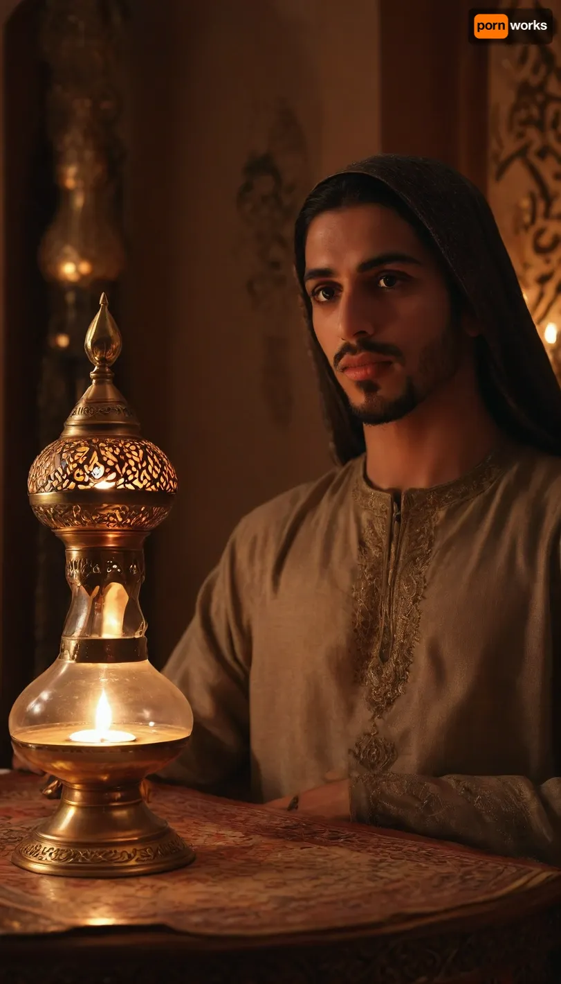 (arab prince in magical golden oil lamp i, n foreground), in background Scheherazade sensual princess from tales from the Arabian Nights watching it, arabian nights ambiance, arabic, calligraphy, dark, skin, <lora:arab_architecture_by_styx:1.5>, <lora:arabic_calligraphy:1.5>, <lora:Darker_skin_SDXL:.8>, <lora:Omani_male:.8>