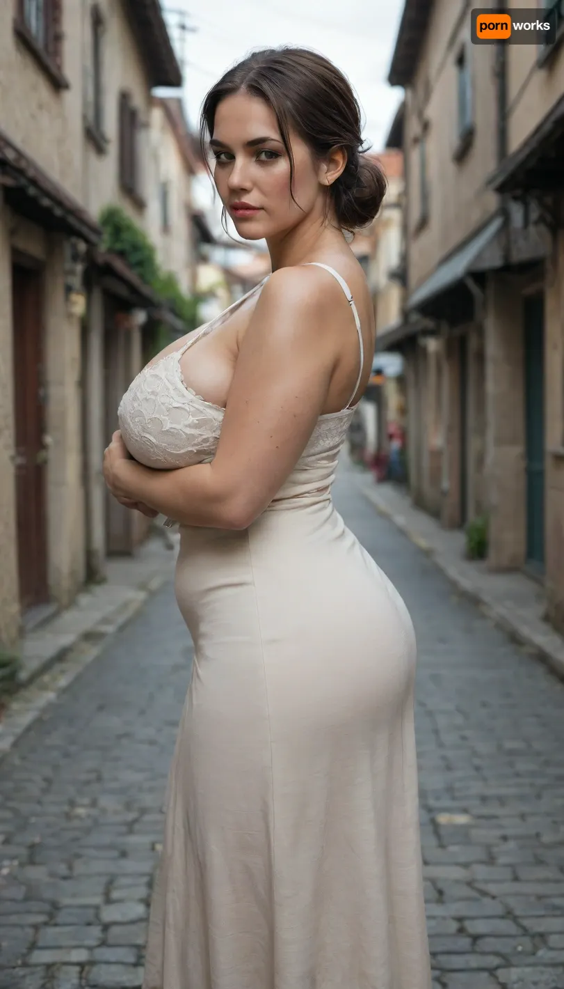 village milkmaid white tatar village style, fantastic maximum bust size, seductive, flirting, huge wide pelvis, wide hips, big huge girl in full height, side view, huge macromastia