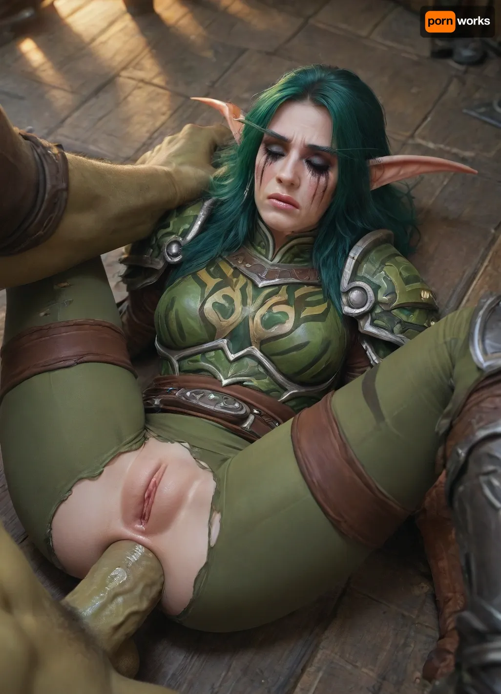 Night elf from world of warcraft, (green hair), (straight tall hair), (closed eye), (closed mouth), (extreme makeup), ((cry, tears)), hunter, (tight pants), (ripped clothes), sundered armor, (legs spread), floor, pussy, (anal sex), (green orc male), forced Night elf from world of warcraft, (green hair), (straight tall hair), (closed eye), (closed mouth), (extreme makeup), ((cry, tears)), hunter, (tight pants), (ripped clothes), sundered armor, (legs spread), floor, pussy, (anal sex), (green orc male), forced