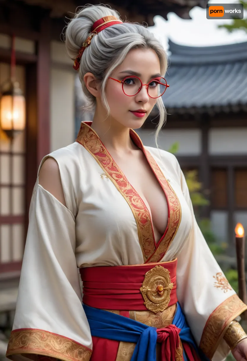 Elf woman, playful/confident expression, winking, adjusting large round thick red rimmed glasses, light gray voluminous hair in a messy bun, ornate golden artificer goggles with intricate patterns and glowing blue accents, traditional-inspired clothing with modern fantasy elements, sleeveless cream-colored top with gold accents red and gold trim and a deep neckline, loose, long-sleeved cream-colored jacket with red accents, prominent chest, red sash with gold details on her waist, long dark blue loincloth, dark blue gloves, holding a traditional Japanese wooden/golden smoking stick with a decorative design, confident/charming pose, curvy figure, large breasts, large hips, thin waist, simple village in the background, Japanese aesthetic, fantasy setting Elf woman, playful/confident expression, winking, adjusting large round thick red rimmed glasses, light gray voluminous hair in a messy bun, ornate golden artificer goggles with intricate patterns and glowing blue accents, traditional-inspired clothing with modern fantasy elements, sleeveless cream-colored top with gold accents red and gold trim and a deep neckline, loose, long-sleeved cream-colored jacket with red accents, prominent chest, red sash with gold details on her waist, long dark blue loincloth, dark blue gloves, holding a traditional Japanese wooden/golden smoking stick with a decorative design, confident/charming pose, curvy figure, large breasts, large hips, thin waist, simple village in the background, Japanese aesthetic, fantasy setting