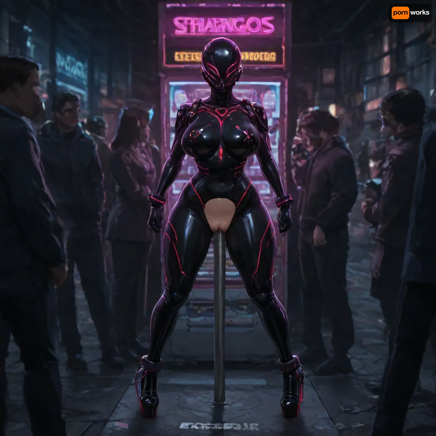(Curvy young woman standing), legs apart, (penetrated by steel pole), ((steel pole from ground to vagina)), (scifi setting), film noir style, slot machine, ((latex clothing)), (colorful neon light stripes on clothing), bladerunner aesthetics, platform heels, small lady, neon signs, display, (strangers walking by), motion blur, people queing, helpless, steel shackles, machine, (open crotch), genetic manipulation, (puffy labia), bare pussy, high angle, trapped, public, objectified, fuckdoll, cyborg, trash, litter, untidy, used holes, ”one bar prison”