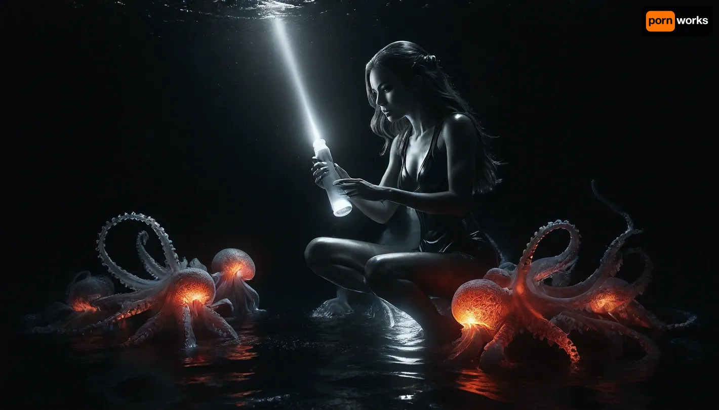 In the depths of the ocean, a breathtaking underwater panorama unfolds. In the foreground, a nude 22 years old skinny deep-sea researcher kneels outside her base station, (beautiful face in focus:1.5), anchored firmly to the ocean floor, (She is collecting much glowing seabed samples:1.6), equipped with a breathing mask, yet her body is nude, The scene is set in the darkness of the deep sea, illuminated by powerful spotlights mounted on the research station, casting a cone of light around her. Beyond this illuminated circle, the water is dark and teeming with life, (many various much glowing deep-sea creatures drift around:1.8), (glowing fishes:1.2), (glowing shark:1.2), (glowing octopus:1.5), (their eerie silhouettes hinting at unseen dangers:1.5), Despite the mysterious and potentially perilous environment, the researcher is depicted with remarkable detail, her skin texture, her facial expression, and her hands as she gathers samples, all rendered in high-resolution realism. In the background, the research station appears as a collection of metallic spheres with large, glowing windows, standing out against the dark abyss. Around her, the mysterious and luminous denizens of the deep sea float, adding an element of wonder and suspense. Dramatic lighting from both the station and the diver’s own equipment accentuates the scene, creating a captivating and immersive atmosphere., firm buttocks, ultra-sharp details, realistic skin texture, refined contrast, 8k detail, authentic facial expression, clean composition, (maximum photo quality:1.4), (maximum resolution:1.5), Black, and, white, art, pencil, shading, charcoal, drawing, toned, paper, brutal, b/w, color, scheme, highly detailed various background, DonMSp3ctr4lXL, <lora:Black and white art.V1:.2>, <lora:sea_monster_lora-000003:.9>, <lora:EnvyAetherbornXL01:1.9>, <lora:DonMSp3ctr4lXL-000008:1.7>, <lora:attractive_notrigger:1.6>